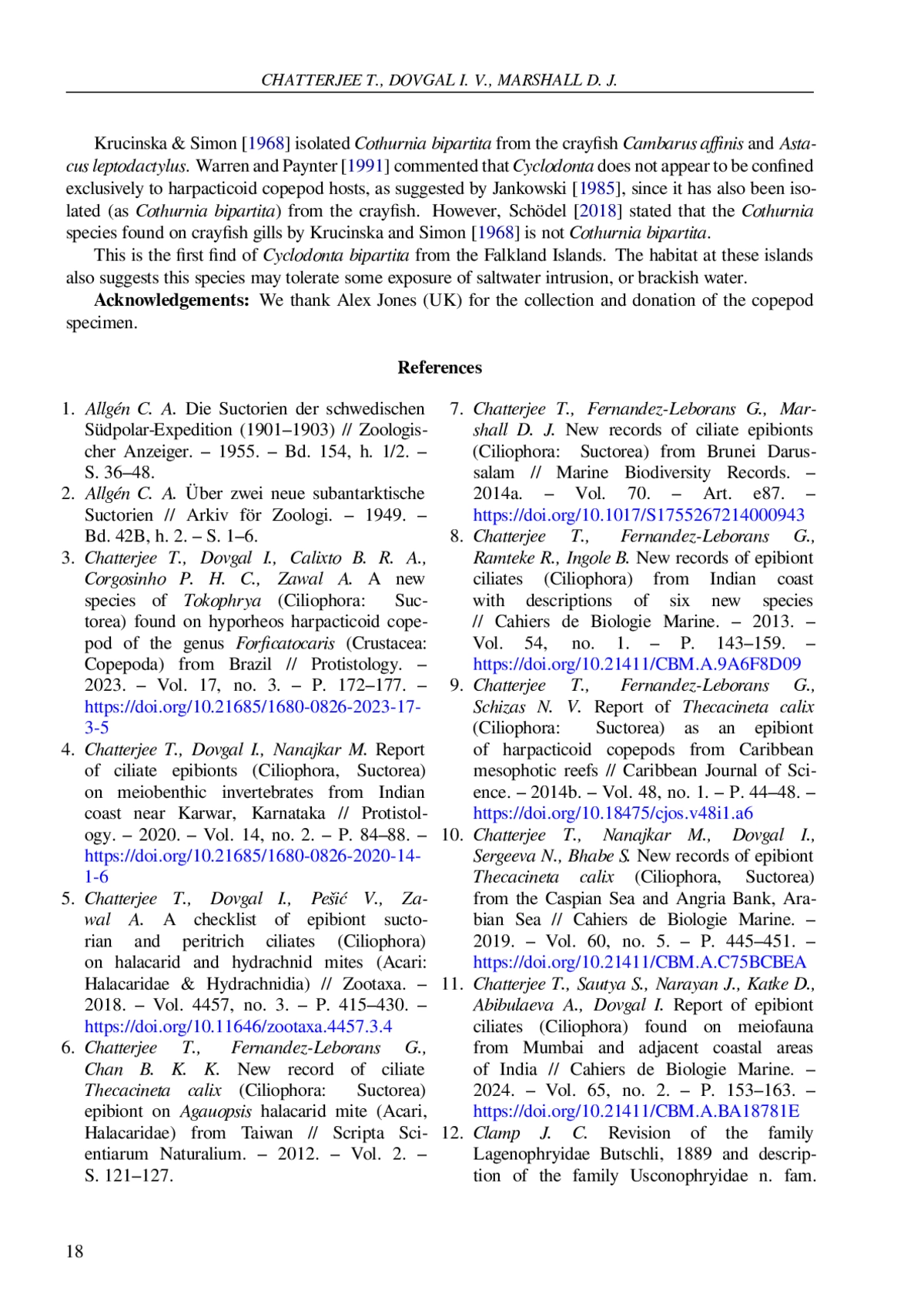 7. Chatterjee T., Fernandez-Leborans G., Marshall D. J. New records of ciliate epibionts (Ciliophora: Suctorea) from Brunei Darussalam // Marine Biodiversity Records. - 2014a. - Vol. 70. - Art. e87. -. DOI: 10.1017/S1755267214000943