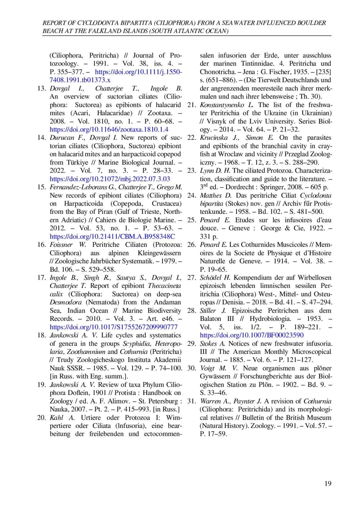 19. Jankowski A. V. Review of taxa Phylum Ciliophora Doflein, 1901 // Protista: Handbook on Zoology / ed. A. F. Alimov. - St. Petersburg: Nauka, 2007. - Pt. 2. - P. 415-993. [in Russ.].