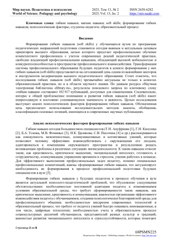 В статье рассматриваются психологические факторы формирования гибких навыков у студентов педагогических направлений подготовки. Трансформация системы профессионального образования будущих педагогов в аспекте формирования у них гибких навыков (soft skills) представляется на сегодняшний день одним из важнейших векторов и инструментов модернизации высшего педагогического образования. Стоит отметить, что исследования гибких навыков (soft skills) чрезвычайно актуальны не только в аспектах образовательной практики, но и в области научного знания.