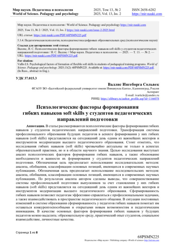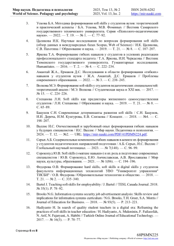 10. Валлис И.С. Отечественный и зарубежный опыт формирования гибких навыков у будущих специалистов / И.С. Валлис // Мир науки. Педагогика и психология. - 2024. - Т. 12. - №2. - URL: https://mir-nauki.com/PDF/41PDMN224.pdf. EDN: AUEZNX