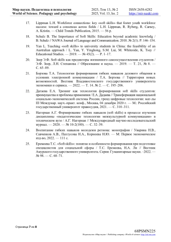 7. Волкова М.Э. Формирование soft-skills у студентов педагогических специальностей: теоретический анализ / М.Э. Волкова // Студенческая наука и XXI век. - 2017. - № 15. - С. 224-226. EDN: YTHRPA