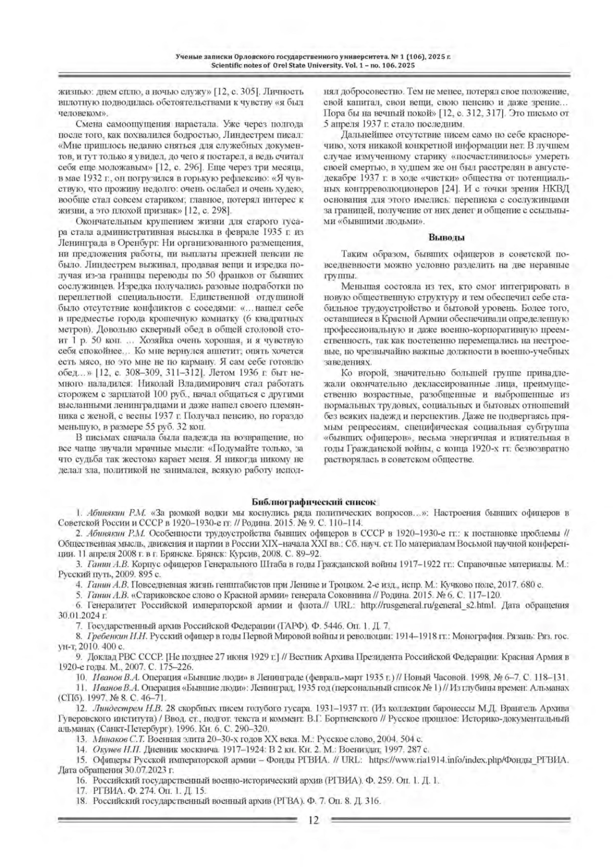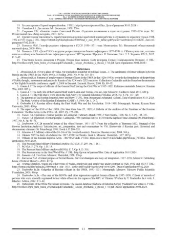 1. Абинякин Р.М. “За рюмкой водки мы коснулись ряда политических вопросов”.: Настроения бывших офицеров в Советской России и СССР в 1920-1930-е гг. // Родина. 2015. № 9. С. 110-114. EDN: UGAOOZ