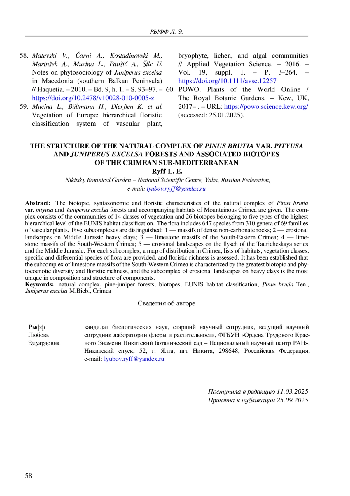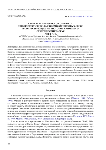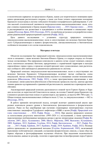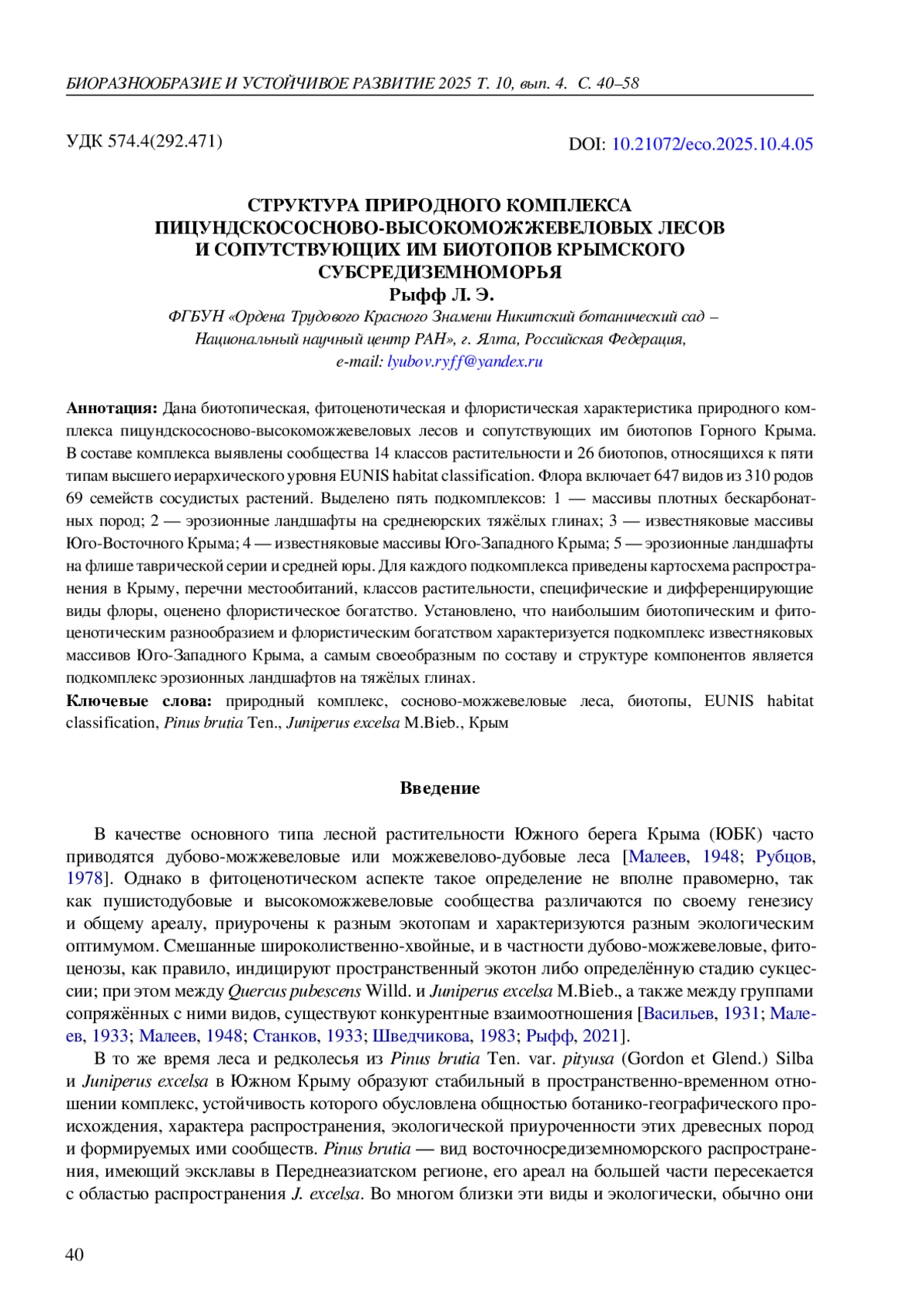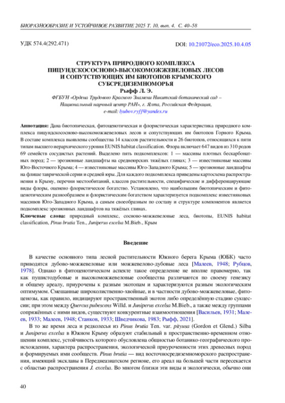 34. Рыфф Л. Э. Природный комплекс сосново-можжевеловых редколесий Крымского Субсредиземноморья: биотопический и фитоценотический аспекты // Изучение и сохранение биоразнообразия в ботанических садах и других интродукционных центрах: тезисы II междунар. науч.-практ. конф. (Донецк - Ялта, 21-25 окт. 2024 г.) / Рос. акад. наук [и др.]. - Симферополь: Ариал, 2024. - С. 81.