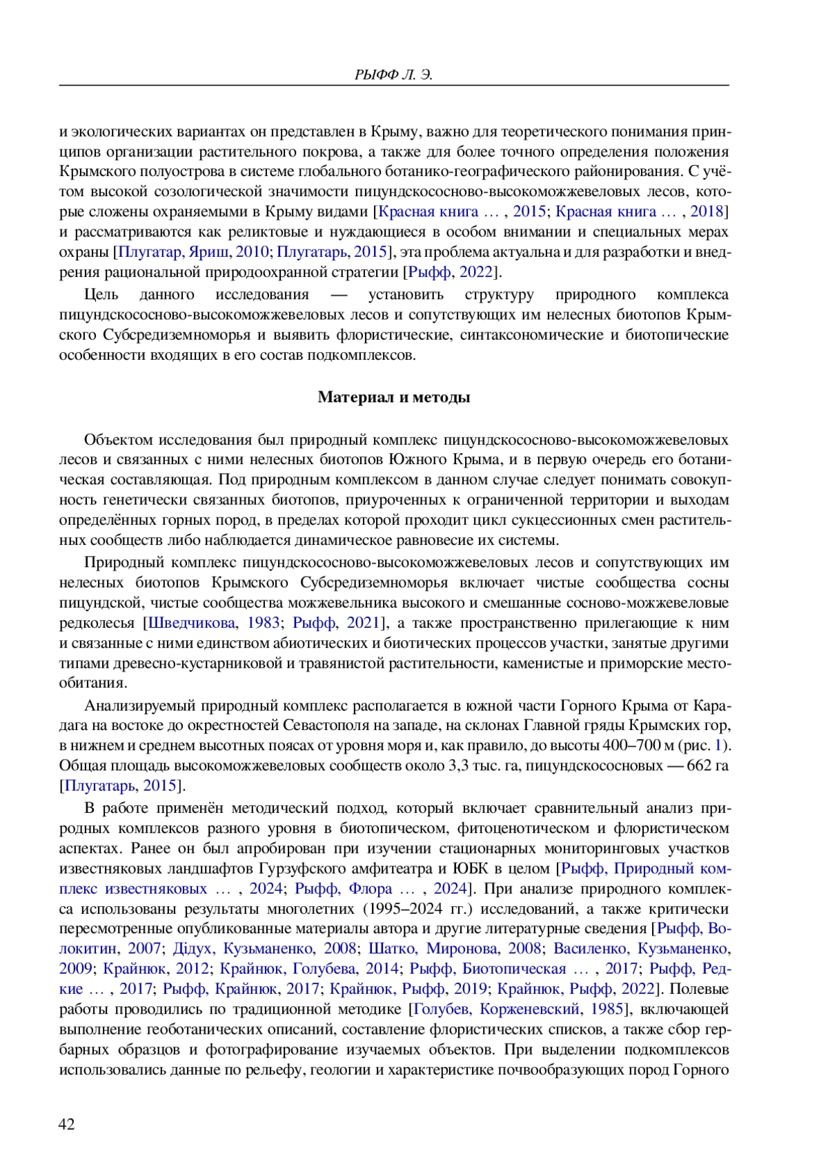 30. Рыфф Л. Э. Ботанико-географические особенности сосново-можжевеловых лесов Горного Крыма // Горные экосистемы и их компоненты: материалы VIII Всерос. конф. с междунар. участием, посвящ. Году науки и технологий в Российской Федерации (Нальчик, 20-25 сент. 2021 г.) / Ин-т экологии гор. территорий им. А. К. Темботова РАН. - Нальчик: ИЭГТ, 2021. - С. 48-49. -.