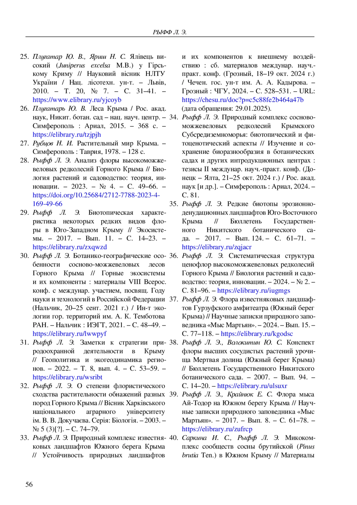 32. Рыфф Л. Э. О степени флористического сходства растительности обнажений разных пород Горного Крыма // Вiсник Харкiвського нацiонального аграрного унiверситету iм. В. В. Докучаєва. Серiя: Бiологiя. - 2003. - № 5 (3)[?]. - С. 74-79.