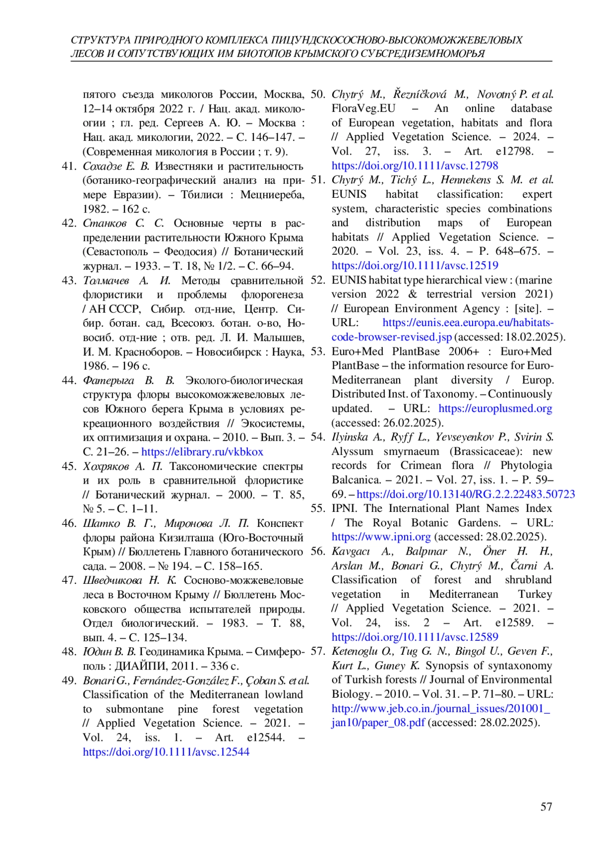 9. Ермаков Н. Б. Высшие единицы сосновых лесов России в связи с общей концепцией классификации растительности Северной Евразии // Биология растений и садоводство: теория, инновации. - 2020. - № 4. - С. 94-113. -. DOI: 10.36305/2712-7788-2020-4-157-94-113