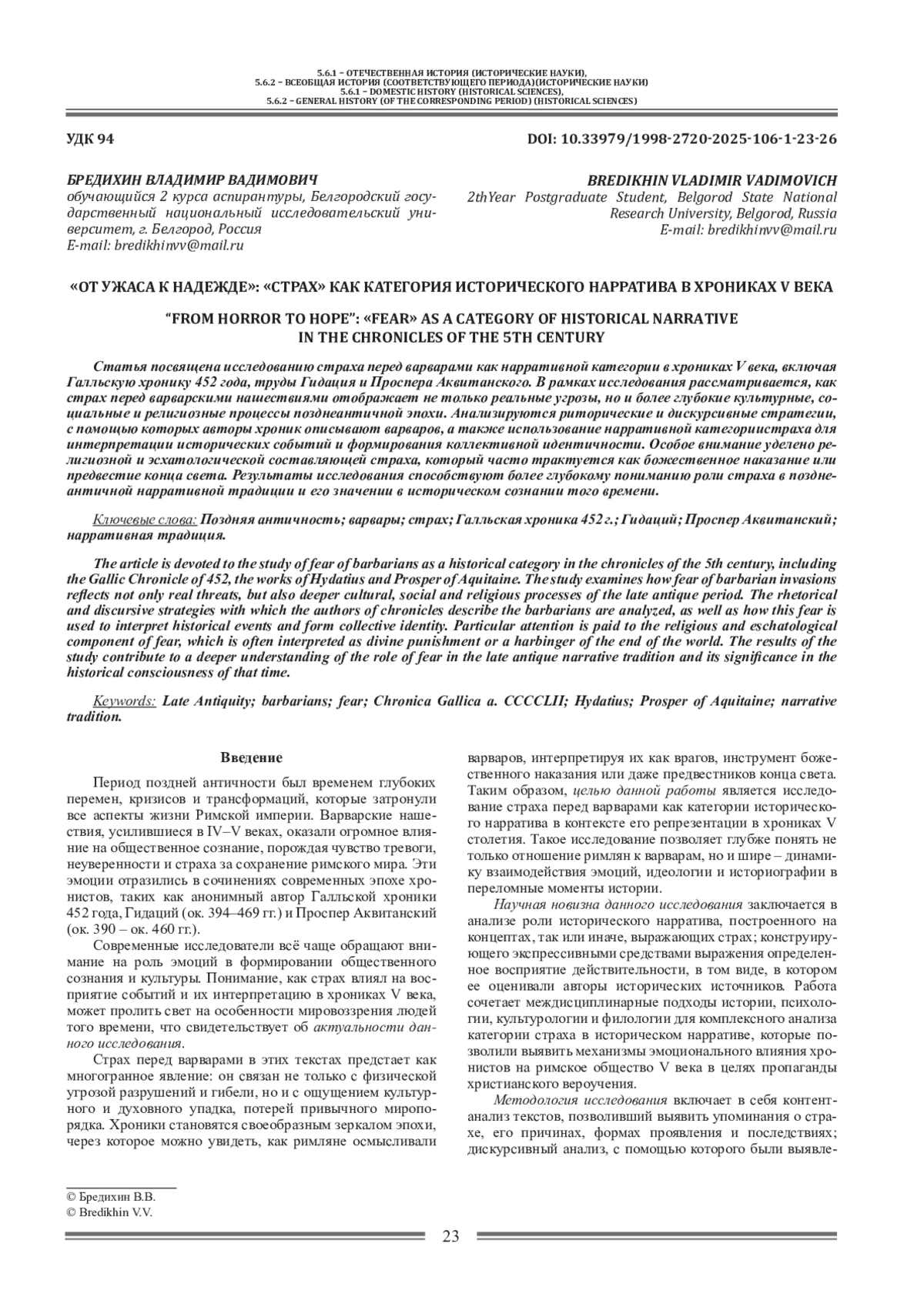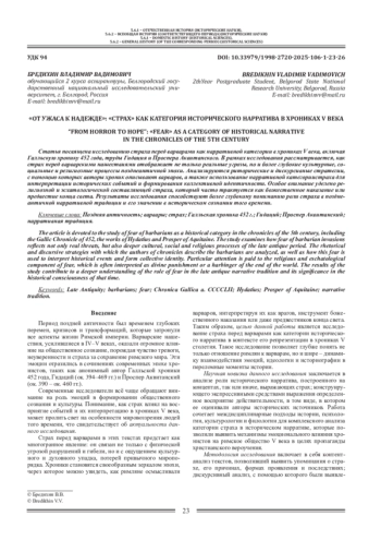 Статья посвящена исследованию страха перед варварами как нарративной категории в хрониках Vвека, включая Галльскую хронику 452 года, труды Гидация и Проспера Аквитанского. В рамках исследования рассматривается, как страх перед варварскими нашествиями отображает не только реальные угрозы, но и более глубокие культурные, социальные и религиозные процессы позднеантичной эпохи. Анализируются риторические и дискурсивные стратегии, с помощью которых авторы хроник описывают варваров, а также использование нарративной категории страха для интерпретации исторических событий и формирования коллективной идентичности. Особое внимание уделено религиозной и эсхатологической составляющей страха, который часто трактуется как божественное наказание или предвестие конца света. Результаты исследования способствуют более глубокому пониманию роли страха в позднеантичной нарративной традиции и его значении в историческом сознании того времени.