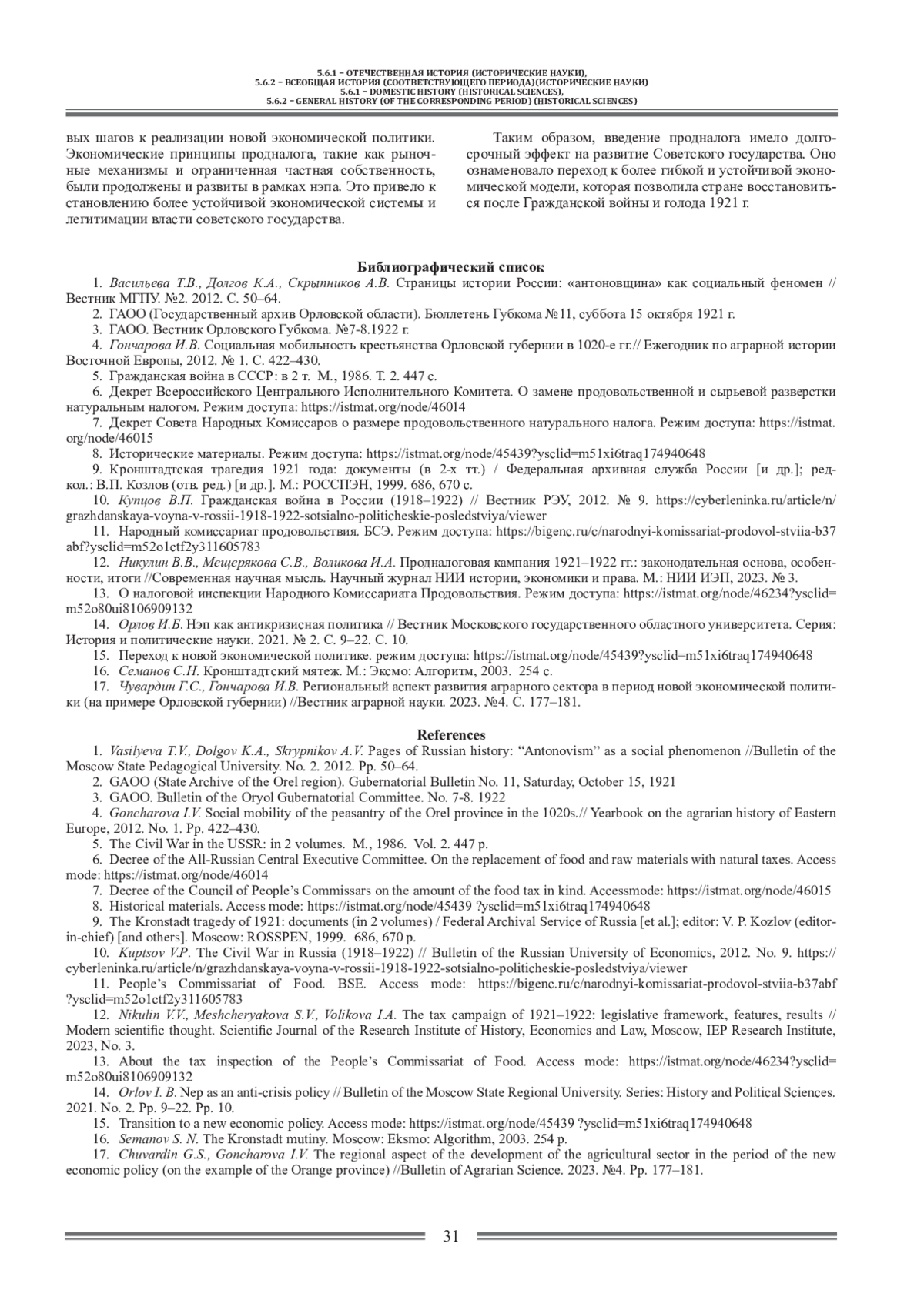 17. Чувардин Г.С., Гончарова И.В. Региональный аспект развития аграрного сектора в период новой экономической политики (на примере Орловской губернии) //Вестник аграрной науки. 2023. №4. C. 177-181.