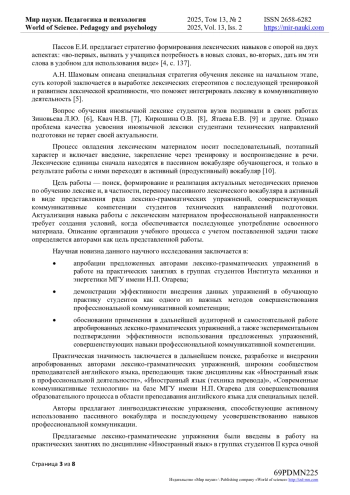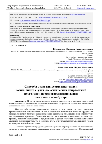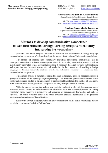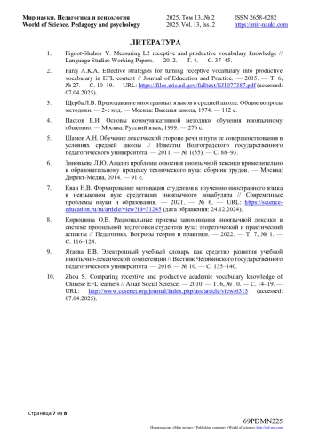 2. Faraj A.K.A. Effective strategies for turning receptive vocabulary into productive vocabulary in EFL context // Journal of Education and Practice. - 2015. - Т. 6, № 27. - С. 10-19. - URL: https://files.eric.ed.gov/fulltext/EJ1077387.pdf (accessed: 07.04.2025).