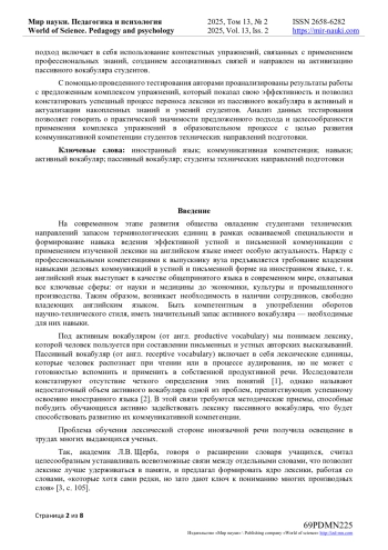 В статье анализируются вопросы становления и развития иноязычной коммуникативной компетенции студентов технических направлений подготовки посредством активизации их пассивного вокабуляра. Процесс обогащения лексического запаса, в том числе за счет овладения профессиональной терминологией и его последующая активизация являются трудоёмкой задачей, поскольку работа по освоению лексики остается на сегодняшний день недостаточно мотивированным процессом. Данные обстоятельства заставляют искать новые методические приемы, наиболее подходящие и продуктивные в рамках обучения иностранному языку студентов российских вузов, что в конечном итоге, будет способствовать повышению уровня их коммуникативной компетенции. Авторами представлен ряд методических приемов, апробированных на практических занятиях в группах студентов направления подготовки «Агроинженерия». Предложенный подход включает в себя использование контекстных упражнений, связанных с применением профессиональных знаний, созданием ассоциативных связей и направлен на активизацию пассивного вокабуляра студентов. С помощью проведенного тестирования авторами проанализированы результаты работы с предложенным комплексом упражнений, который показал свою эффективность и позволил констатировать успешный процесс переноса лексики из пассивного вокабуляра в активный и актуализации накопленных знаний и умений студентов. Анализ данных тестирования позволяет говорить о практической значимости предложенного подхода и целесообразности применения комплекса упражнений в образовательном процессе с целью развития коммуникативной компетенции студентов технических направлений подготовки.