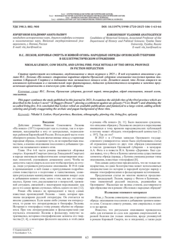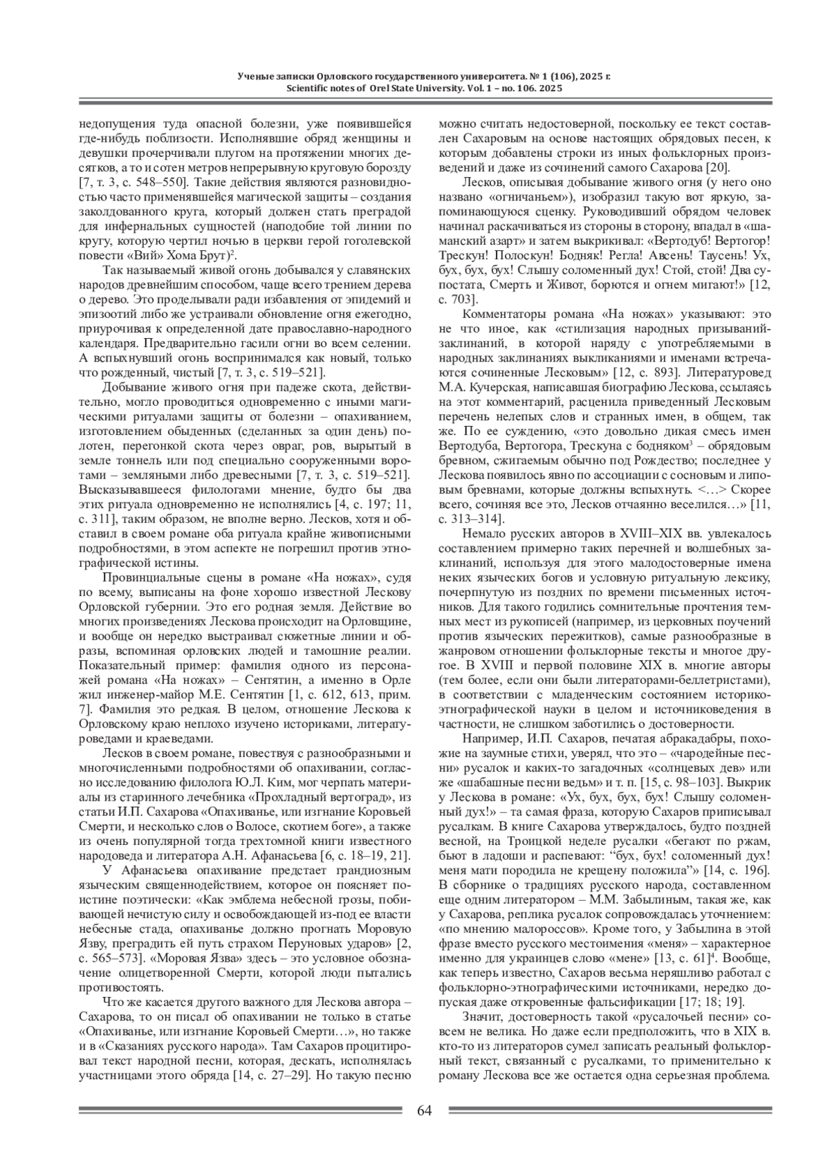 В ней изучаются описанные в романе Н. С. Лескова «На ножах» старинные народные обряды Орловской губернии: опахивание поселения против эпизоотии («Коровьей Смерти») и добывание так называемого живого огня. Делается вывод, что Лесков опирался на имевшиеся публикации и в значительной мере фантазировал, добавляя художественного колорита и заметно преувеличивая архаичность и языческую суть этих обрядов.