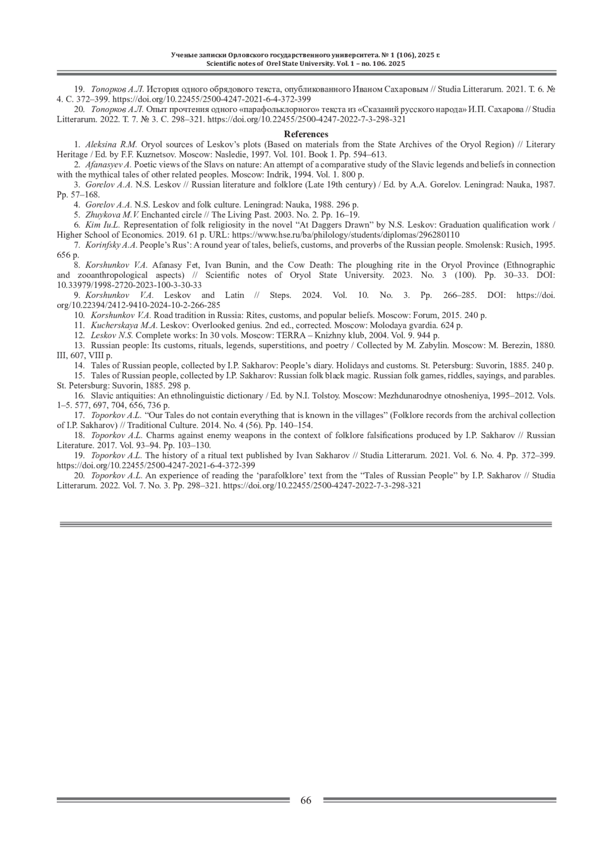 20. Топорков А.Л. Опыт прочтения одного “парафольклорного” текста из “Сказаний русского народа” И.П. Сахарова // Studia Litterarum. 2022. Т 7. № 3. С. 298-321. DOI: 10.22455/2500-4247-2022-7-3-298-321 EDN: BDDEUL