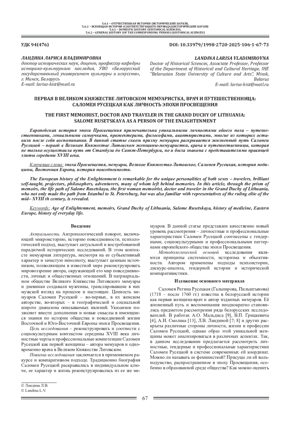 7. Ландзта Л.У. Прафесшныя веды i лекавыя сродю Саламеi Русецкай (1718 - пасля 1760) // Этнакультурныя даследаванш флоры Беларуа Х1Х-ХХ стст. - Х Тышкевщк1я чытанш, Мядзел, 20 верас. 2024 г.: зб. навук. арт. / М-ва культуры Рэсп. Беларусь, Беларус. дзярж. ун-т культуры i мастацтвау, Мядзел. р-ны выканаучы камттэт, / Рэдкал.: А. I. Смолж (адк. рэд.), Л. У Ланлзша, В.М. Сакалова. М1нск, БДУКМ, 2024. С. 39-48.