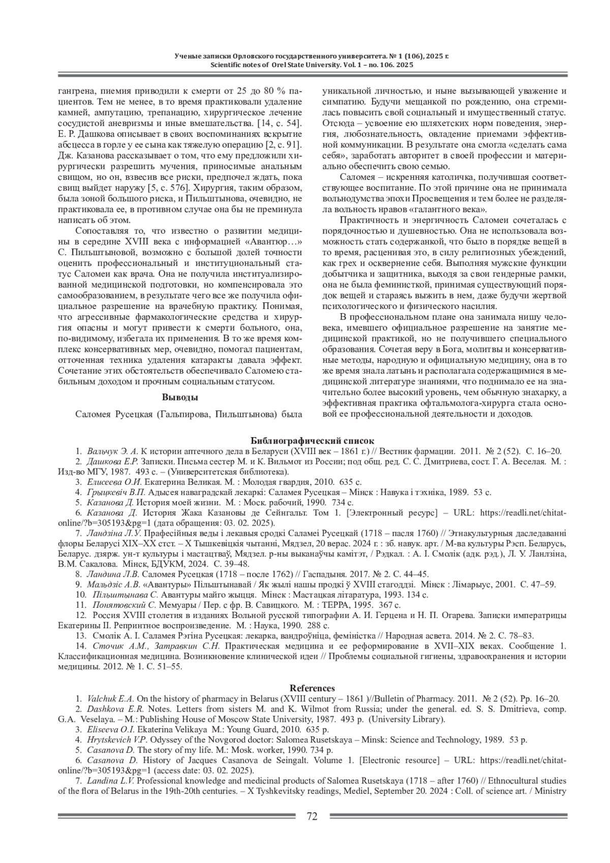13. Смолж А. I. Саламея Рэгша Русецкая: лекарка, вандроунща, фемшстка // Народная асвета. 2014. № 2. С. 78-83. EDN: XZFQNQ