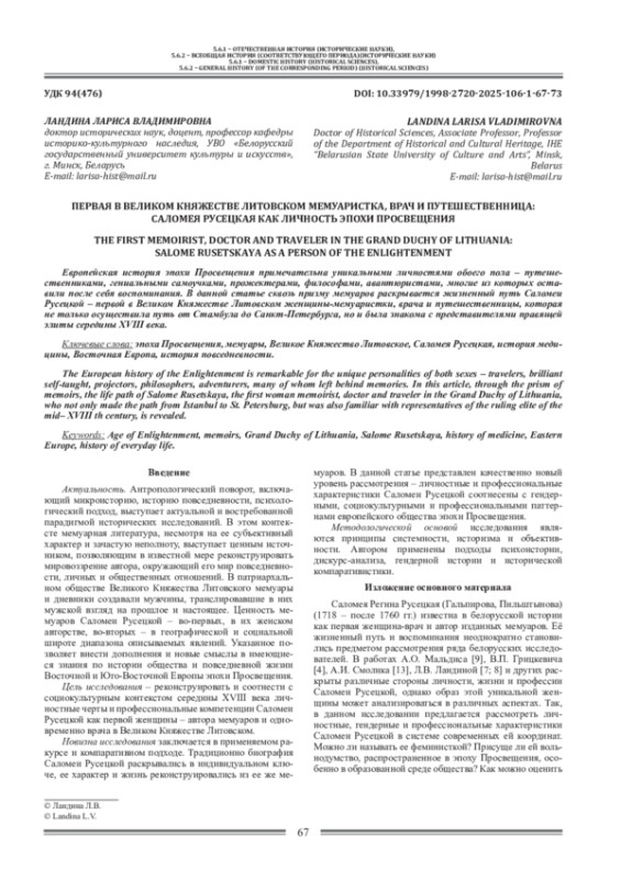 Европейская история эпохи Просвещения примечательна уникальными личностями обоего пола - путешественниками, гениальными самоучками, прожектерами, философами, авантюристами, многие из которых оставили после себя воспоминания. В данной статье сквозь призму мемуаров раскрывается жизненный путь Саломеи Русецкой - первой в Великом Княжестве Литовском женщины-мемуаристки, врача и путешественницы, которая не только осуществила путь от Стамбула до Санкт-Петербурга, но и была знакома с представителями правящей элиты середины XVIII века.