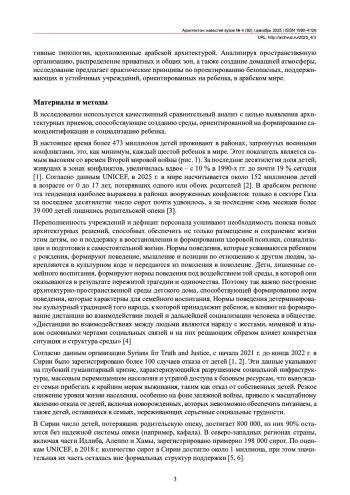 Исследование посвящено архитектурному проектированию детских домов в арабском мире с особым вниманием к Сирии и городу Алеппо. В работе анализируются современные детские дома с точки зрения типологии, функционального планирования и пространственной организации, включая такие параметры, как масштаб учреждения, соотношение между приватными и общими зонами, а также разделение на дневные и ночные секции. Международные исследования указывают на тенденцию отказа от крупных институциональных приютов в пользу гуманистических, семейно ориентированных моделей, способствующих эмоциональному и психологическому благополучию детей (Smith & Smith, 2019; UNICEF, 2022). Изучение арабской архитектуры, включая труды Хассана Фатхи, показывает, что традиционные пространственные решения – приватные комнаты, общие дворы и четкое разделение дневных и ночных зон – способствовали социальной интеграции (Fathy, 1986; Al-Harithy, 2018). Однако в настоящее время существует ограниченное количество исследований, связывающих эти традиционные принципы с современным проектированием детских домов, особенно в регионах, затронутых конфликтами, таких как Сирия. Это создает значительный пробел в архитектурных и социальных аспектах темы.