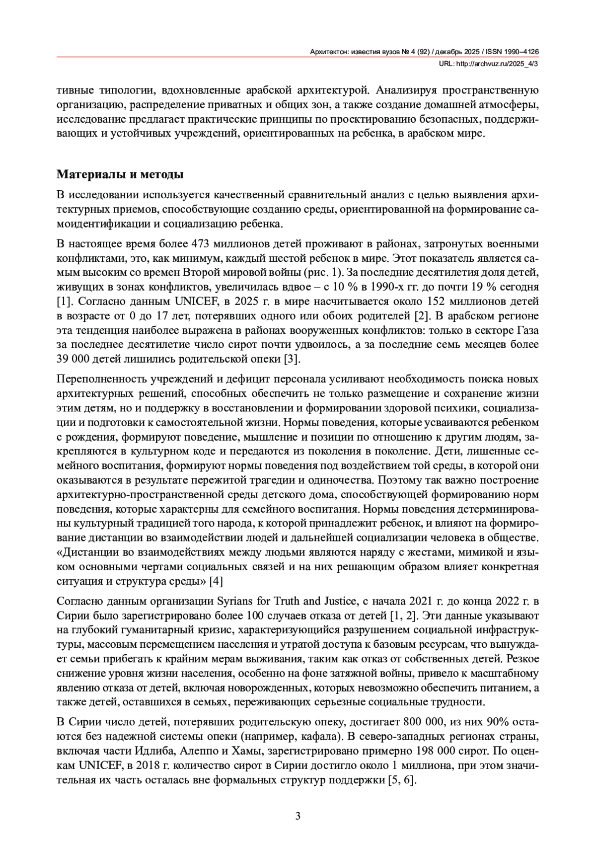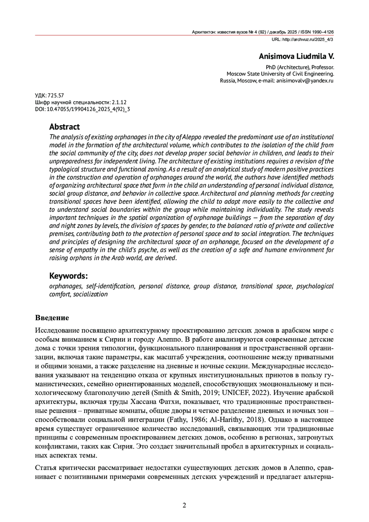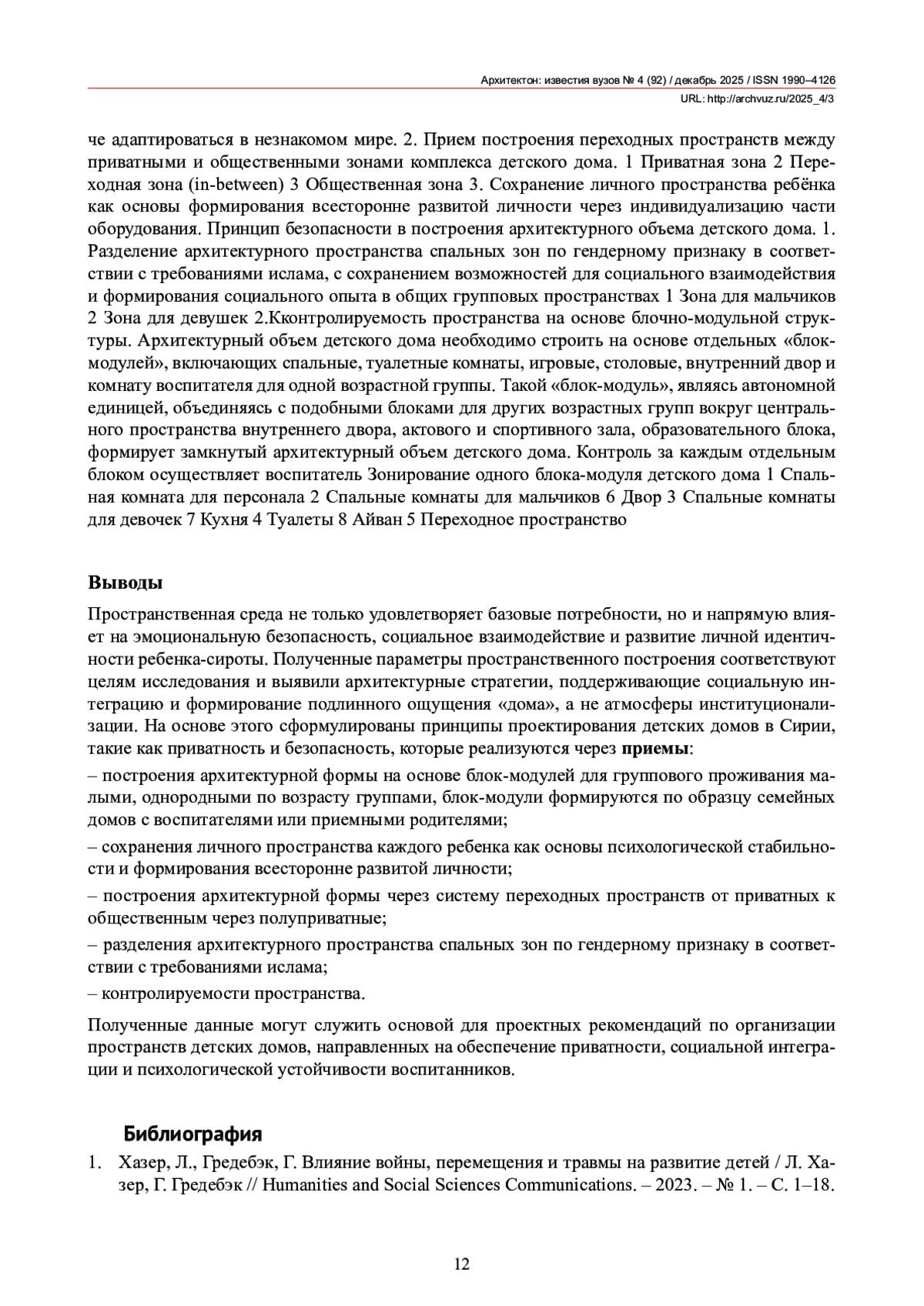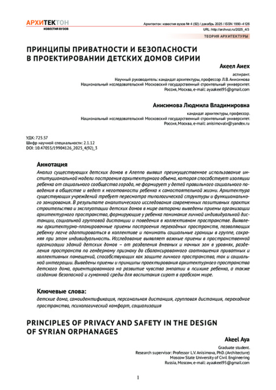 Анализ существующих детских домов в Алеппо выявил преимущественное использование институциональной модели построения архитектурного объема, которая способствует изоляции ребенка от социального сообщества города, не формирует у детей правильного социального поведения в обществе и ведет к неготовности ребенка к самостоятельной жизни. Архитектура существующих учреждений требует пересмотра типологической структуры и функционального зонирования. В результате аналитического исследования современных позитивных практик строительства и эксплуатации детских домов в мире авторами выведены приемы организации архитектурного пространства, формирующие у ребенка понимание личной индивидуальной дистанции, социальной групповой дистанции и поведения в коллективном пространстве. Выявлены архитектурно-планировочные приемы построения переходных пространств, позволяющих ребенку легче адаптироваться в коллективе и понимать социальные границы в группе, сохраняя при этом индивидуальность. Исследование выявляет важные приемы в пространственной организации зданий детских домов – от разделения дневных и ночных зон в уровнях, разделения пространств по гендерному признаку до сбалансированного соотношения приватных и коллективных помещений, способствующих как защите личного пространства, так и социальной интеграции. Выведены приемы и принципы проектирования архитектурного пространства детского дома, ориентированного на развитие чувства эмпатии в психике ребенка, а также созданию безопасной и гуманной среды для воспитания сирот в арабском мире.