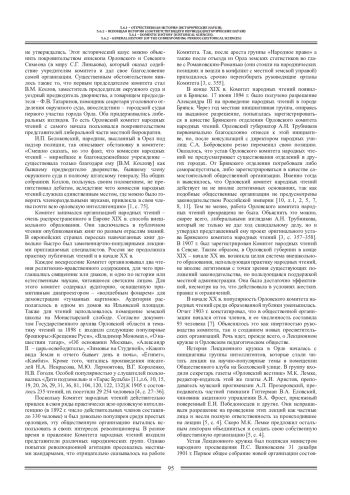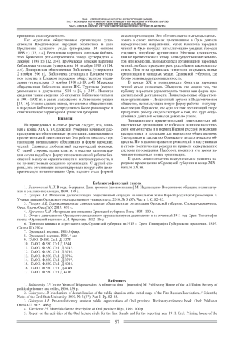 До революции просвещение населения России всегда оставалась важной составной частью работы провинциальной русской интеллигенции. Просветительная деятельность носила весьма разнообразный характер, в том числе осуществлялась через развитие внешкольного образования. Развитием внешкольного образования занимались просветительные общественные организации: общественные библиотеки, общества по распространению знаний и кружки самообразования. Подобные общественные организации возникали и в Орловской губернии, более того, в конце XIX - начале ХХ вв. здесь была создана целая система общественных организаций, занимающихся вопросами просвещения. Статья посвящена истории становления и развития этой системы.