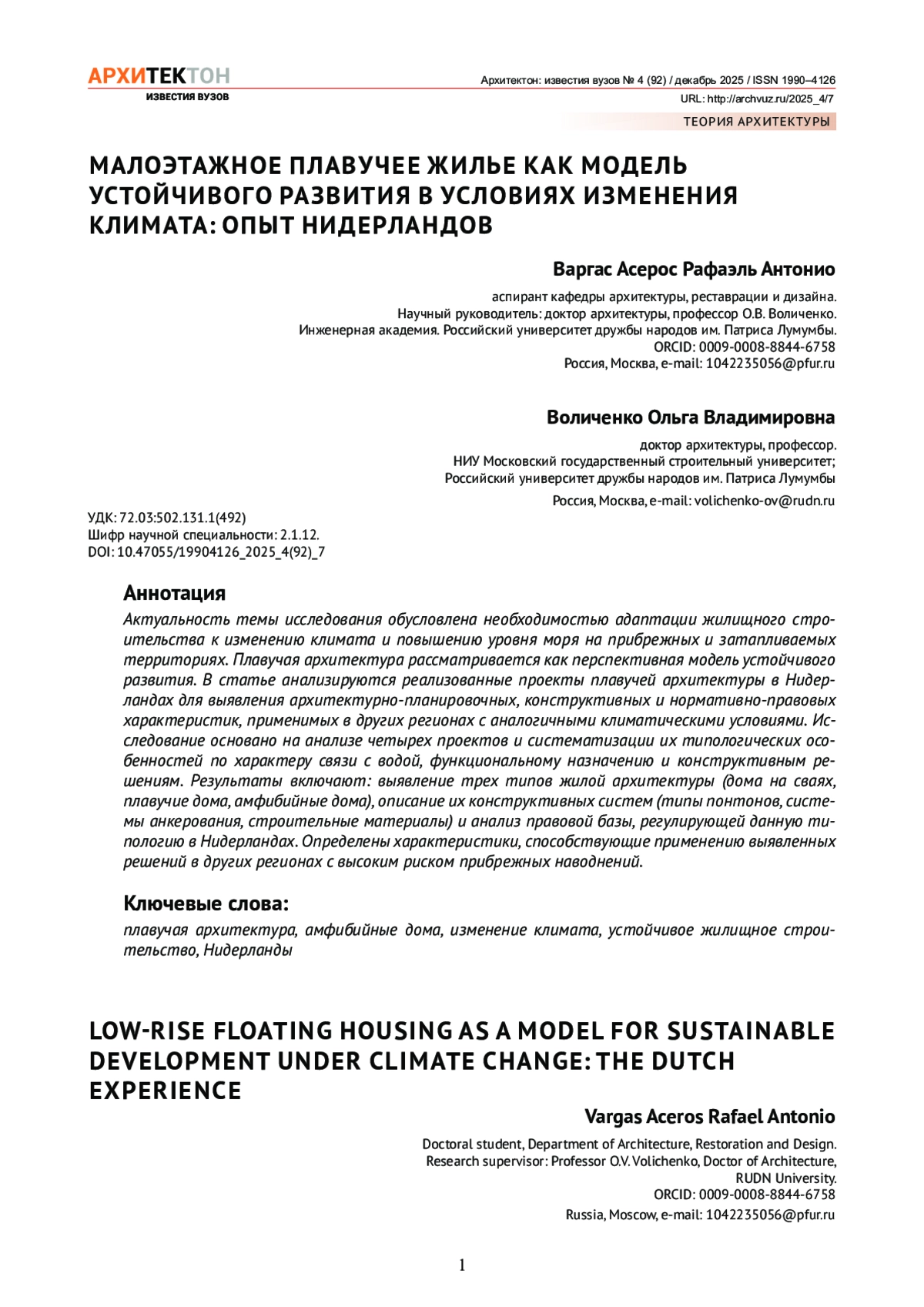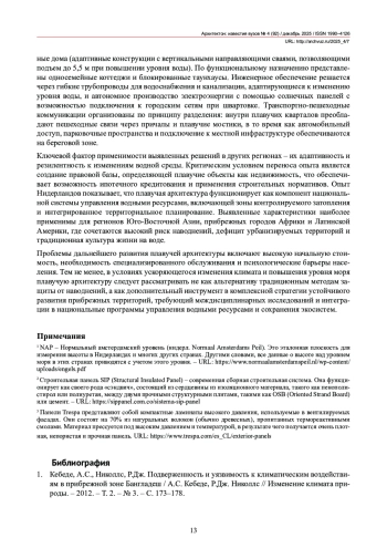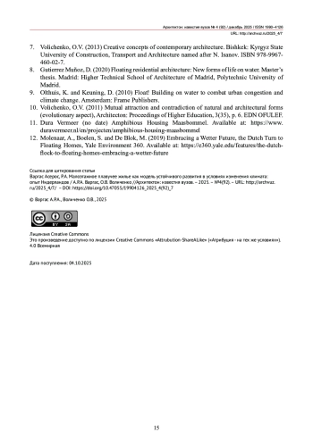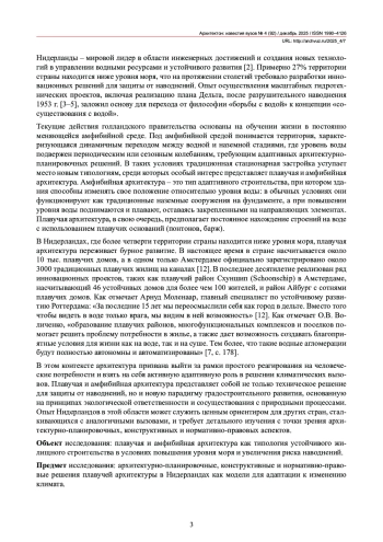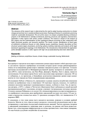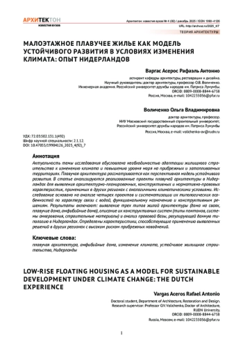 Актуальность темы исследования обусловлена необходимостью адаптации жилищного строительства к изменению климата и повышению уровня моря на прибрежных и затапливаемых территориях. Плавучая архитектура рассматривается как перспективная модель устойчивого развития. В статье анализируются реализованные проекты плавучей архитектуры в Нидерландах для выявления архитектурно-планировочных, конструктивных и нормативно-правовых характеристик, применимых в других регионах с аналогичными климатическими условиями. Исследование основано на анализе четырех проектов и систематизации их типологических особенностей по характеру связи с водой, функциональному назначению и конструктивным решениям. Результаты включают: выявление трех типов жилой архитектуры (дома на сваях, плавучие дома, амфибийные дома), описание их конструктивных систем (типы понтонов, системы анкерования, строительные материалы) и анализ правовой базы, регулирующей данную типологию в Нидерландах. Определены характеристики, способствующие применению выявленных решений в других регионах с высоким риском прибрежных наводнений.