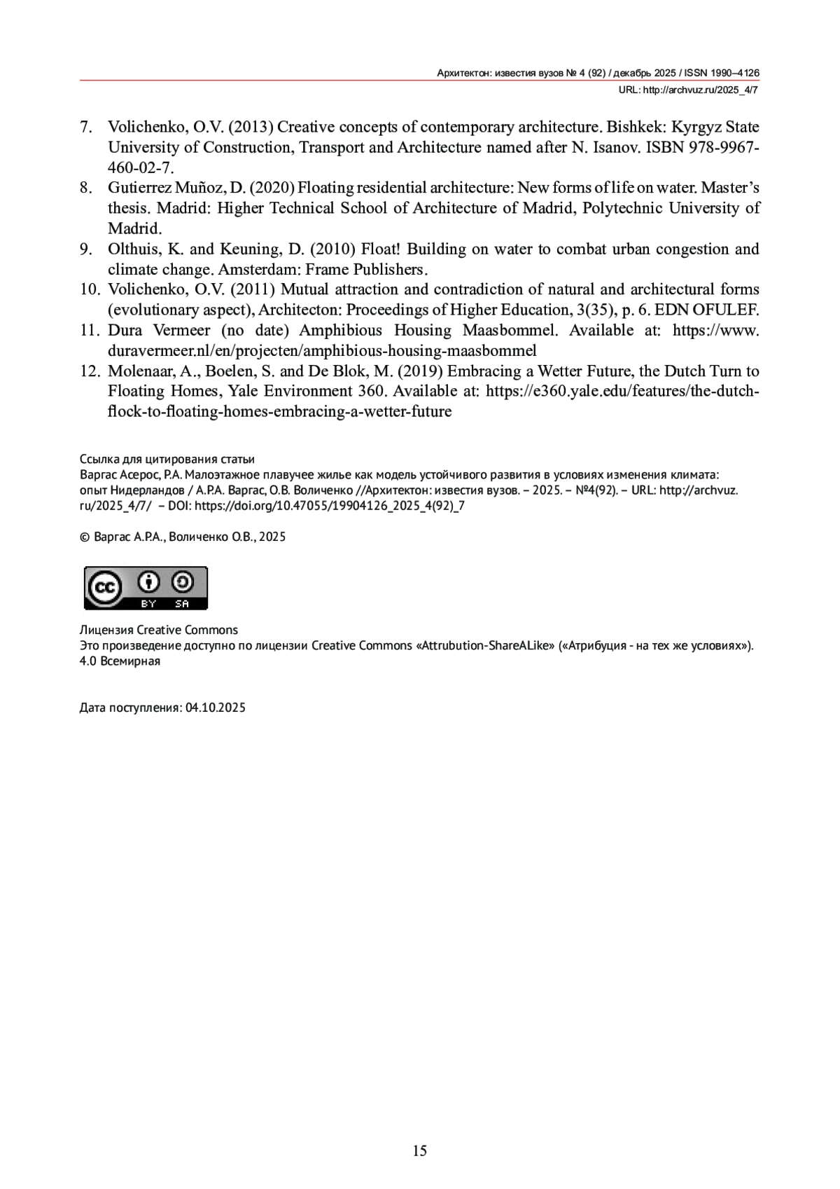 10. Воличенко, О.В. Взаимное тяготение и противоречие природных и архитектурных форм (эволюционный аспект) / О.В. Воличенко // Архитектон: известия вузов. - 2011. - № 3 (35). - С. 6.