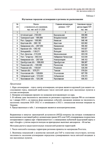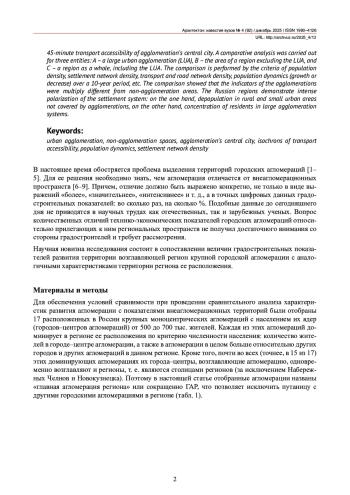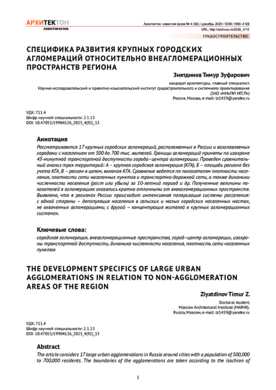 Рассматриваются 17 крупных городских агломераций, расположенных в России и возглавляемых городами с населением от 500 до 700 тыс. жителей. Границы агломераций приняты по изохроне 45-минутной транспортной доступности города–центра агломерации. Проведен сравнительный анализ трех территорий: А – крупная городская агломерация (КГА), Б – площадь региона без учета КГА, В – регион в целом, включая КГА. Сравнение ведется по показателям плотности населения, плотности сети населенных пунктов и транспортно-дорожной сети, а также динамики численности населения (рост или убыль) за 10-летний период и др. Полученные величины показателей в агломерациях оказались кратно отличными от внеагломерационных пространств. Выявлено, что в регионах России происходит интенсивная поляризация системы расселения: с одной стороны – депопуляция населения в сельских и малых городских населенных местах, не охваченных агломерациями, с другой – концентрация жителей в крупных агломерационных системах.