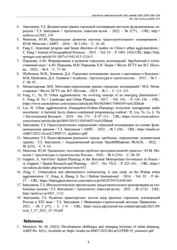 1. Моисеев, Ю.М. Вызовы развития и меняющиеся горизонты градостроительного планирования / Ю.М. Моисеев // AMIT. - 2022. - № 4 (61). - URL: https://marhi.ru/AMIT/2022/4kvart22/PDF/19_moisseev.pdf.