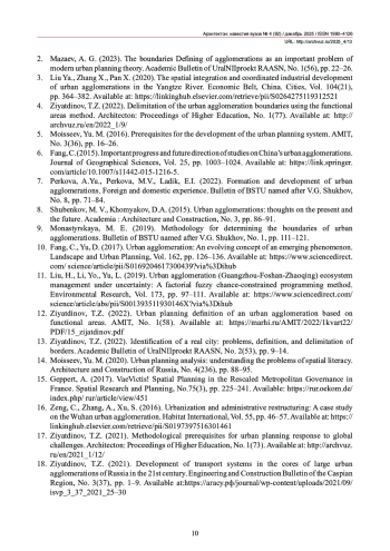 2. Мазаев, А.Г. Определение границ агломераций как важная проблема современной градостроительной теории / А.Г. Мазаев // Академический вестник УралНИИПроект РААСН. - 2023. - № 1(56). - С. 22-26.