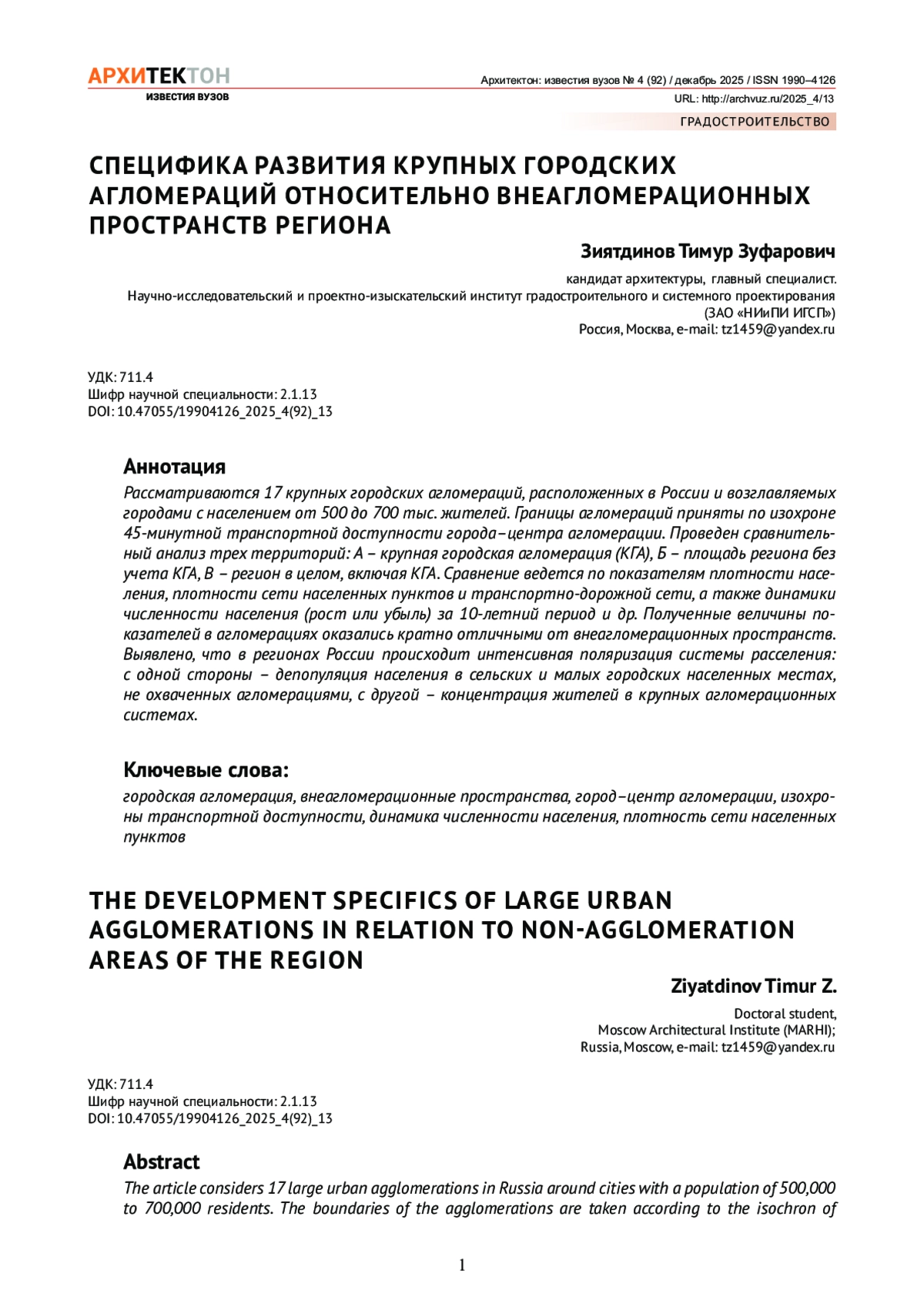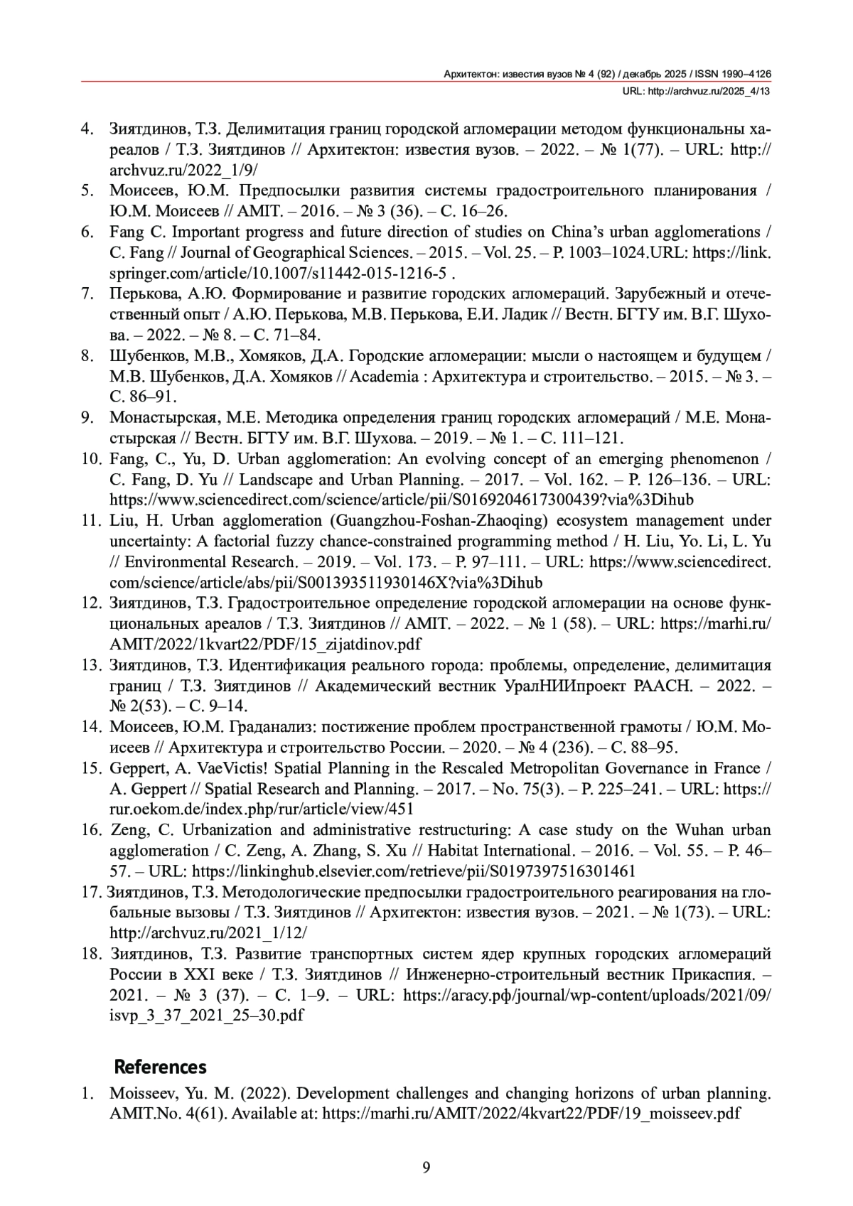 12. Зиятдинов, Т.З. Градостроительное определение городской агломерации на основе функциональных ареалов / Т.З. Зиятдинов // AMIT. - 2022. - № 1 (58). - URL: https://marhi.ru/AMIT/2022/1kvart22/PDF/15_zijatdinov.pdf.