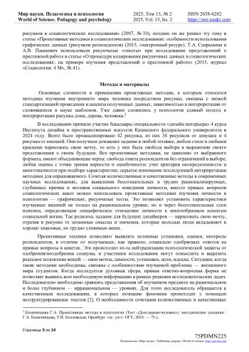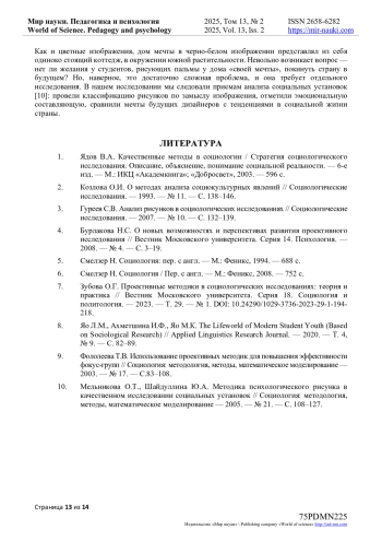 10. Мельникова О.Т., Шайдуллина Ю.А. Методика психологического рисунка в качественном исследовании социальных установок // Социология: методология, методы, математическое моделирование - 2005. - № 21. - С. 108-127.
