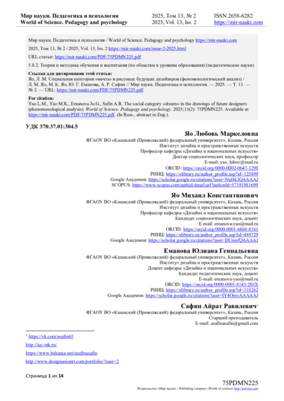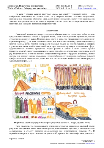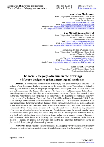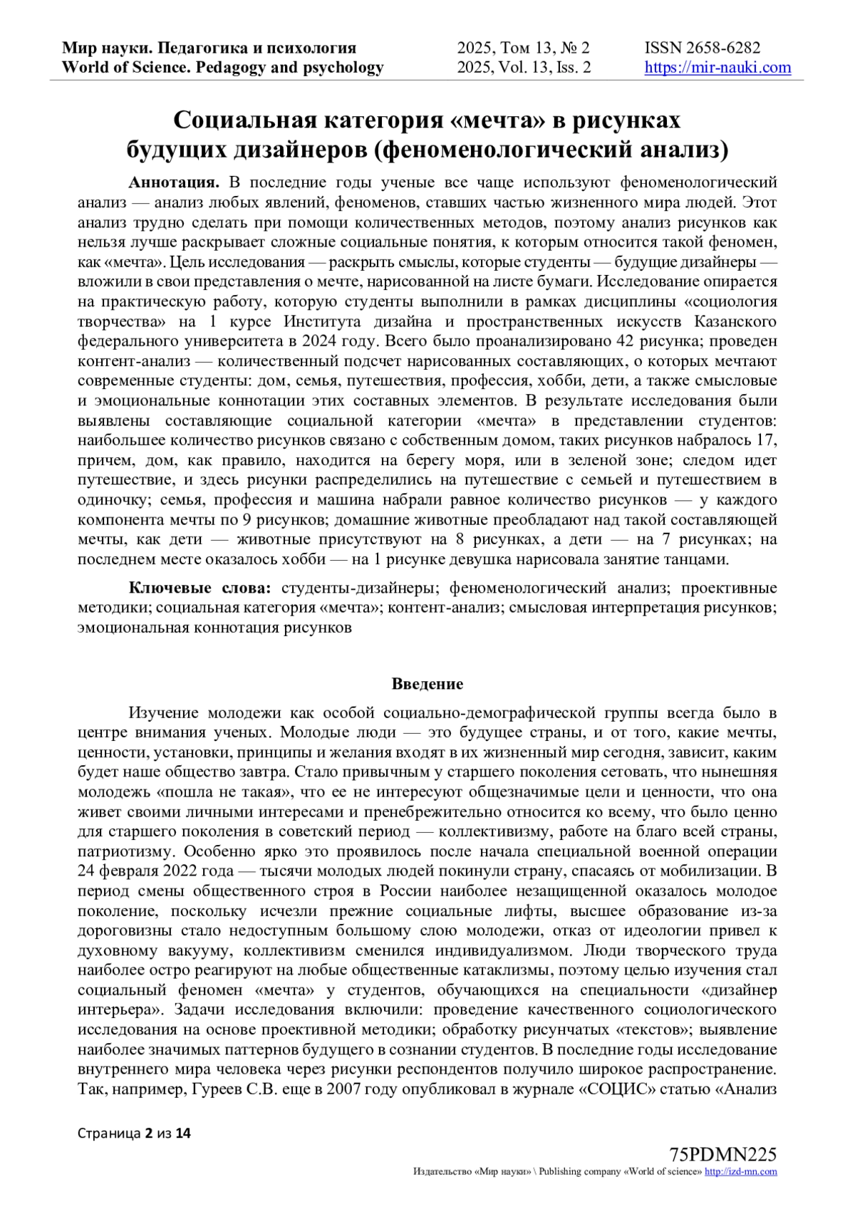 В последние годы ученые все чаще используют феноменологический анализ - анализ любых явлений, феноменов, ставших частью жизненного мира людей. Этот анализ трудно сделать при помощи количественных методов, поэтому анализ рисунков как нельзя лучше раскрывает сложные социальные понятия, к которым относится такой феномен, как «мечта». Цель исследования - раскрыть смыслы, которые студенты - будущие дизайнеры - вложили в свои представления о мечте, нарисованной на листе бумаги. Исследование опирается на практическую работу, которую студенты выполнили в рамках дисциплины «социология творчества» на 1 курсе Института дизайна и пространственных искусств Казанского федерального университета в 2024 году. Всего было проанализировано 42 рисунка; проведен контент-анализ - количественный подсчет нарисованных составляющих, о которых мечтают современные студенты: дом, семья, путешествия, профессия, хобби, дети, а также смысловые и эмоциональные коннотации этих составных элементов. В результате исследования были выявлены составляющие социальной категории «мечта» в представлении студентов: наибольшее количество рисунков связано с собственным домом, таких рисунков набралось 17, причем, дом, как правило, находится на берегу моря, или в зеленой зоне; следом идет путешествие, и здесь рисунки распределились на путешествие с семьей и путешествием в одиночку; семья, профессия и машина набрали равное количество рисунков - у каждого компонента мечты по 9 рисунков; домашние животные преобладают над такой составляющей мечты, как дети - животные присутствуют на 8 рисунках, а дети - на 7 рисунках; на последнем месте оказалось хобби - на 1 рисунке девушка нарисовала занятие танцами.