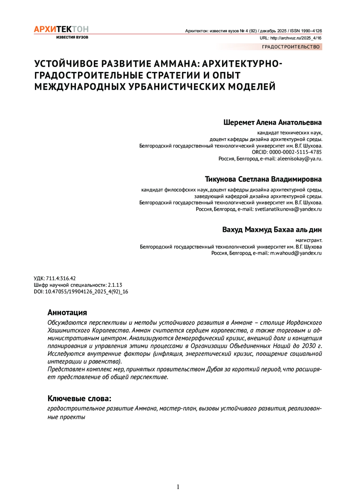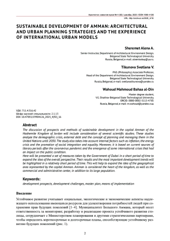 Обсуждаются перспективы и методы устойчивого развития в Аммане – столице Иорданского Хашимитского Королевства. Амман считается сердцем королевства, а также торговым и административным центром. Анализируются демографический кризис, внешний долг и концепция планирования и управления этими процессами в Организации Объединенных Наций до 2030 г. Исследуются внутренние факторы (инфляция, энергетический кризис, поощрение социальной интеграции и равенства).