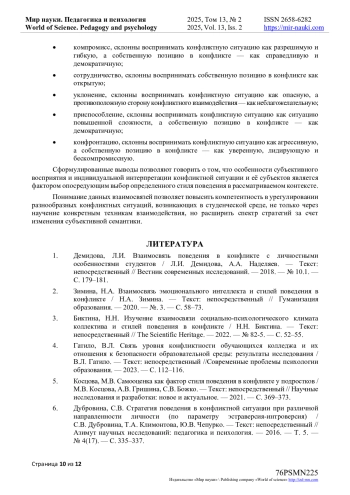 1. Демидова, Л.И. Взаимосвязь поведения в конфликте с личностными особенностями студентов / Л.И. Демидова, А.А. Наделяев. - Текст: непосредственный // Вестник современных исследований. - 2018. - № 10.1. - С. 179-181. EDN: SITPTF