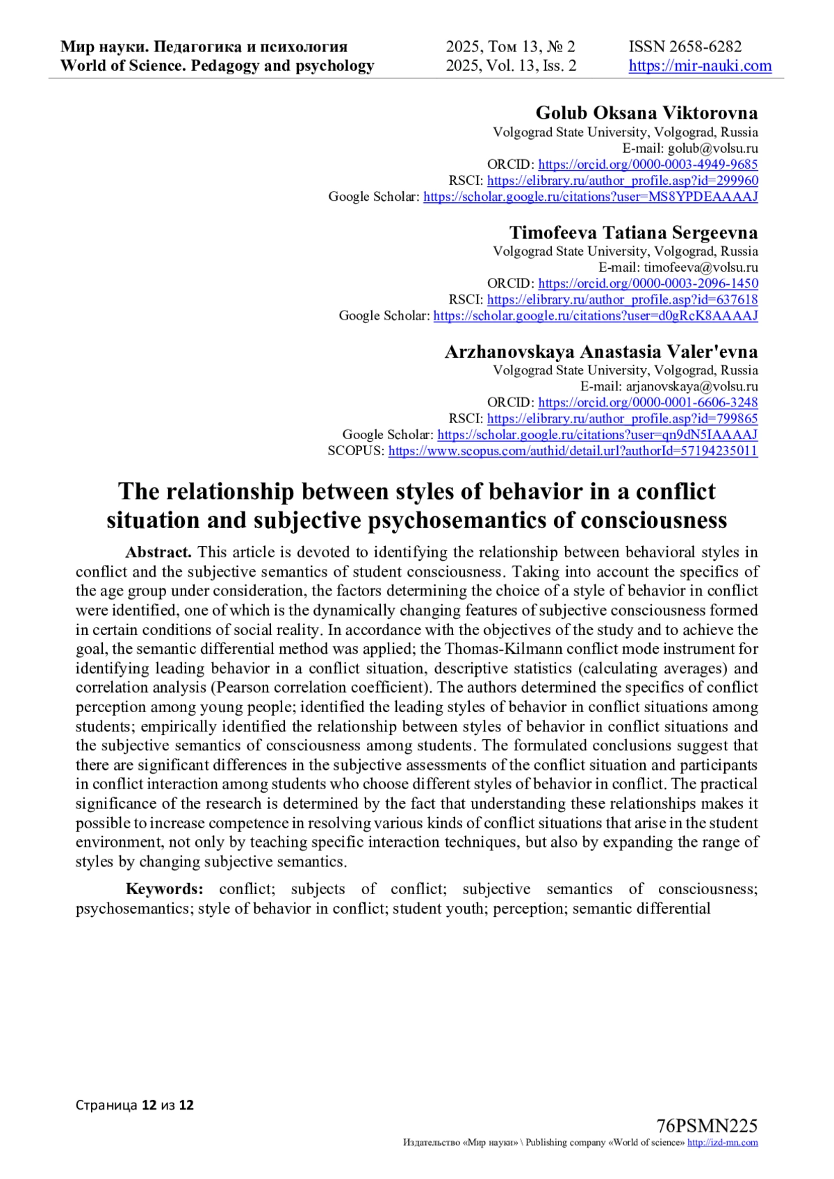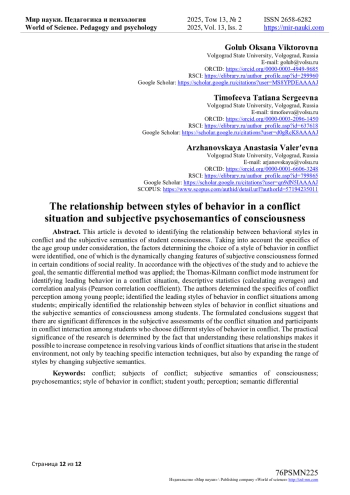 Данная статья посвящена выявлению взаимосвязи стилей поведения в конфликте и субъективной семантики сознания студенческой молодежи. С учетом специфики рассматриваемой возрастной группы были определены факторы, обусловливающие выбор стиля поведения в конфликте, одним из которых выступают динамично меняющиеся особенности субъективного сознания, формируемые в определенных условиях социальной действительности. В соответствии с задачами исследования и для реализации поставленной цели были применены метод семантического дифференциала; методика Томаса-Килманна на выявление ведущего поведения в конфликтной ситуации, описательная статистика (подсчет средних) и корреляционный анализ (коэффициент корреляции Пирсона). Авторами определена специфика восприятия конфликта в молодежной среде; выявлены ведущие стили поведения в конфликтной ситуации у представителей студенческой молодежи; эмпирически выявлена взаимосвязь стилей поведения в конфликтной ситуации и субъективной семантики сознания у студенческой молодежи. Сформулированные выводы позволяют говорить о том, что существуют значимые различия в субъективных оценках конфликтной ситуации и участников конфликтного взаимодействия у студентов, выбирающих разные стили поведения в конфликте.