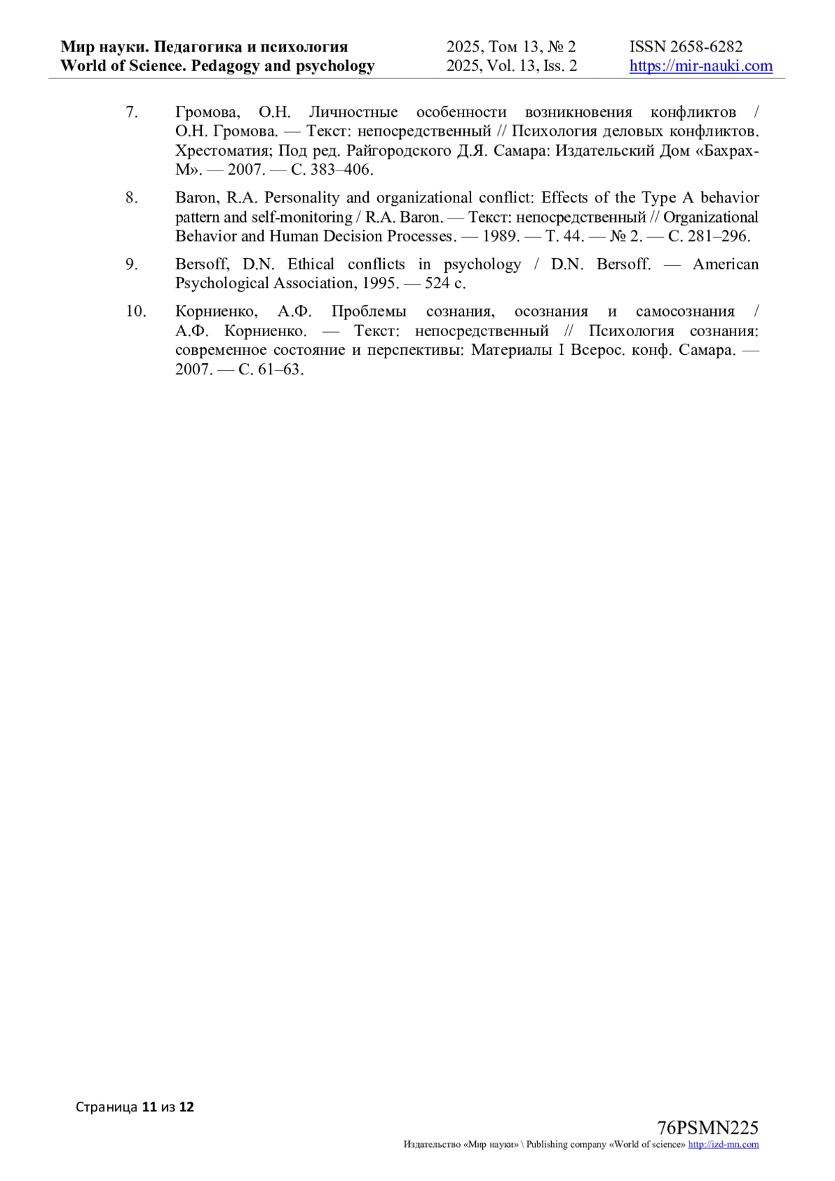 8. Baron, R.A. Personality and organizational conflict: Effects of the Type A behavior pattern and self-monitoring / R.A. Baron. - Текст: непосредственный // Organizational Behavior and Human Decision Processes. - 1989. - Т. 44. - № 2. - С. 281-296.