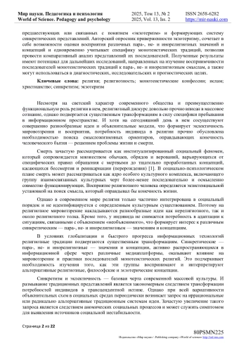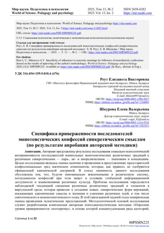 Авторами представлены результаты исследования социально-психологической восприимчивости последователей влиятельных монотеистических религиозных традиций к различным синкретическим - пара-, не- и инорелигиозным - значениям и концепциям.