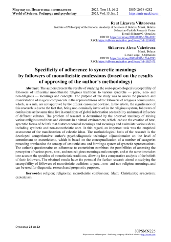 Целью исследования являлась оценка наличия и проявления в представлениях представителей конфессиональных сред магических компонентов, которые, как правило, не одобряются официальной канонической доктриной. В статье значимость данного исследования обусловлена тем, что, будучи неноминально вовлеченными в религиозную систему, последователи конфессий при этом живут в условиях глобальной информационной доступности и взаимовлияния различных культур. Проблема исследования определяется наблюдаемой тенденцией смешения различных религиозных традиций и элементов в виртуальной среде, которая приводит к созданию новых, синкретических форм верований, искажающих канонические смыслы и значения и усвоению различных идей, в том числе синтетического и немонотеистического толка. В этой связи важной задачей стала эмпирическая оценка проявления эклектических представлений. Методологической основой исследования служит разработанная комплексная авторская психодиагностическая методика «Опросник уровня приверженности экзотеризму», в основе которой концептуализация ряда категорий, предшествующих или связанных с понятием «экзотеризм» и формирующих систему синкретических представлений. Авторский опросник приверженности экзотеризму, сочетает в себе возможности оценки восприятия различных пара-, не- и инорелигиозных значений и концепций и одновременно учитывает специфику монотеистических традиций, позволяя провести компаративный анализ представлений их последователей.