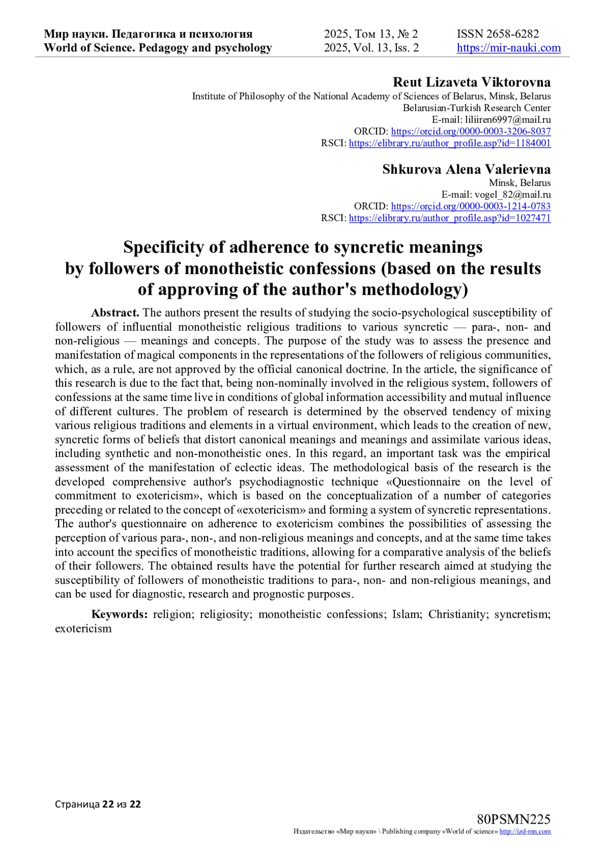 54. Реут Е.В., Шкурова Е.В. Особенности приверженности различным формам магических представлений (на основе апробации авторской методики исследования) / Е.В. Реут, Е.В. Шкурова // Журнал Белорусского государственного университета. Философия. Психология. - 2024. - № 2. - С. 47-59. EDN: HISPQC
