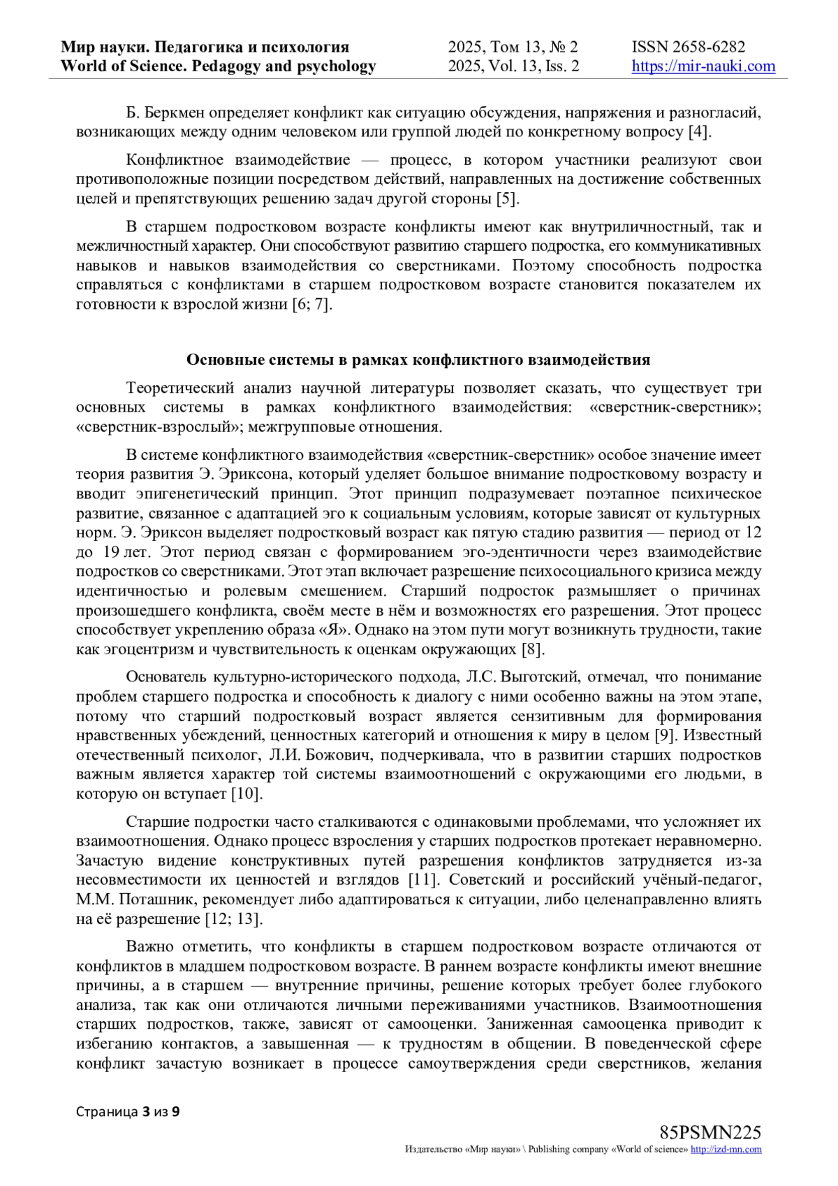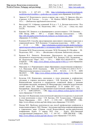 4. Erses T., Kiliç Y., Berkmen B. The relationship of emotional abuse, self-value and conflict resolution needs in secondary school students / T. Erses, Y. Kiliç, B. Berkmen - // Frontiers in Psychology. - 2022. - Vol. 13. - p. 13. - URL: https://www.frontiersin.org/journals/psychology/articles//full (дата обращения 14.01.2025). DOI: 10.3389/fpsyg.2022.966702 EDN: HWFKGP