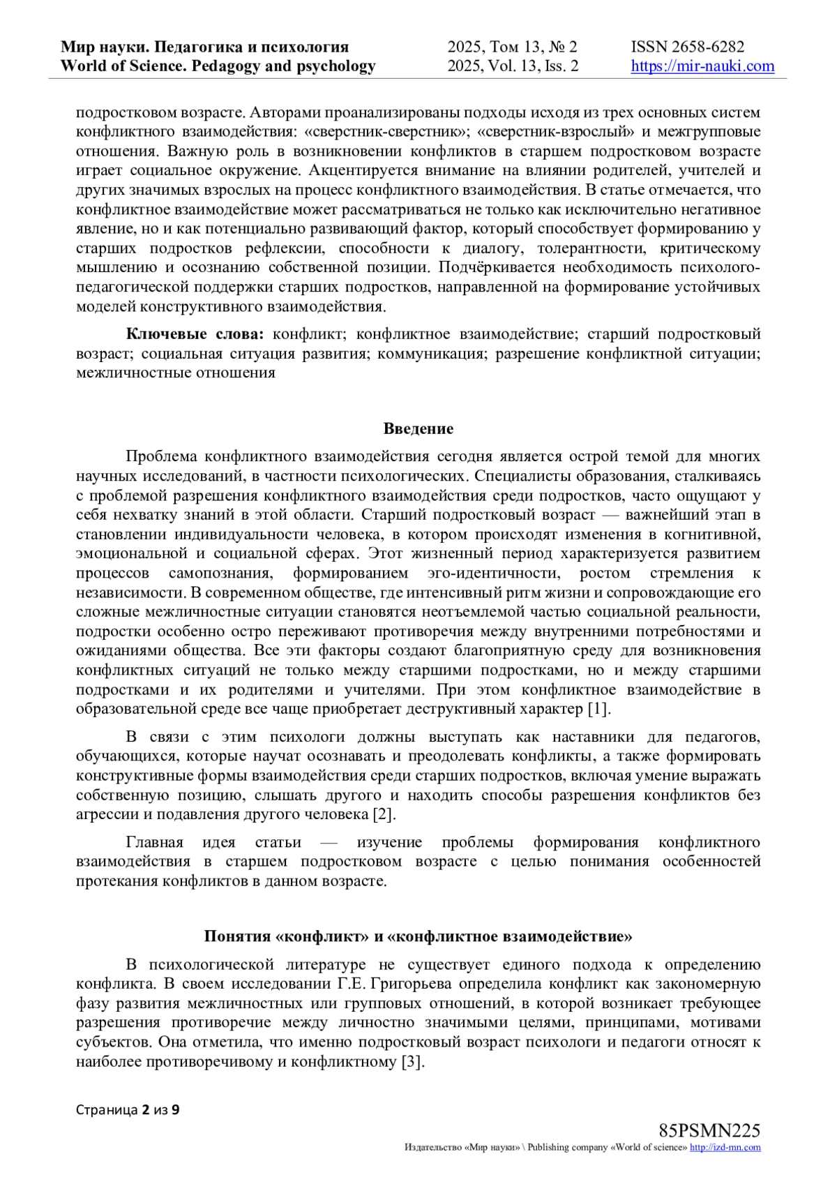 В данной статье проводится комплексный теоретический анализ исследований по проблеме формирования межличностного взаимодействия, в частности конфликтного взаимодействия в процессе становления личности старшего подростка. Старший подростковый возраст характеризуется резкими изменениями в структуре самосознания, стремлением к автономии, самоутверждению, что неизбежно приводит к конфликтам в различных сферах взаимодействия. В центре внимания теоретического исследования - природа, формы и функции межличностных конфликтов, а также их влияние на ключевые аспекты личностного становления старших подростков, включая развитие эго-идентичности, формирование нравственного сознания, коммуникативной компетентности и социальных ролей. В статье отмечается, что старший подростковый возраст является сензитивным периодом, в котором на первый план выходят такие психологические особенности, как повышенная эмоциональная лабильность, эгоцентризм, нестабильность самооценки, повышенная чувствительность к внешней оценке и повышенная потребность в признании. Данные характеристики становятся предпосылками возникновения конфликтов в старшем подростковом возрасте. Авторами проанализированы подходы исходя из трех основных систем конфликтного взаимодействия: «сверстник-сверстник»; «сверстник-взрослый» и межгрупповые отношения. Важную роль в возникновении конфликтов в старшем подростковом возрасте играет социальное окружение. Акцентируется внимание на влиянии родителей, учителей и других значимых взрослых на процесс конфликтного взаимодействия. В статье отмечается, что конфликтное взаимодействие может рассматриваться не только как исключительно негативное явление, но и как потенциально развивающий фактор, который способствует формированию у старших подростков рефлексии, способности к диалогу, толерантности, критическому мышлению и осознанию собственной позиции. Подчёркивается необходимость психолого-педагогической поддержки старших подростков, направленной на формирование устойчивых моделей конструктивного взаимодействия.