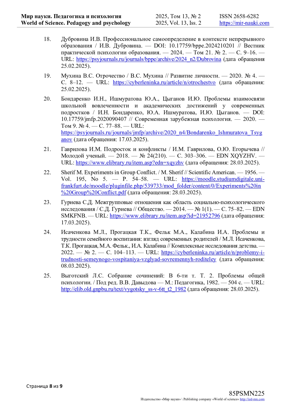 21. Гаврилова И.М. Подросток и конфликты / И.М. Гаврилова, О.Ю. Егорычева // Молодой ученый. - 2018. - № 24(210). - С. 303-306. - URL: item.asp?edn= (дата обращения: 28.03.2025). EDN: XQYZHV
