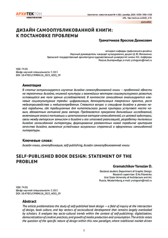 В статье актуализируется изучение дизайна самоопубликованнй книги – проблемной области на пересечении дизайна, книжной культуры и важнейших векторов социокультурного развития, остающейся вне поля зрения исследователей. В контексте самоиздания анализируются ключевые социокультурные тренды: цифровизация, демократизация творческих практик, рост медиапроизводства и медиапотребления. Ставится вопрос о специфике дизайна в рамках новой парадигмы, где традиционные для читательского рынка критерии уступают место новым, адекватным активной роли автора. Предлагается программа дальнейших исследований, включающая анализ мотивации и целеполагания авторов-самоиздателей, их целевой аудитории, связи между авторским замыслом о дизайне и его итоговой реализацией, разработку типологии дизайна самоизданной литературы, формирование релевантных новой парадигме критериев качества дизайна, выявление устойчивых визуальных стратегий в оформлении самоизданной литературы.