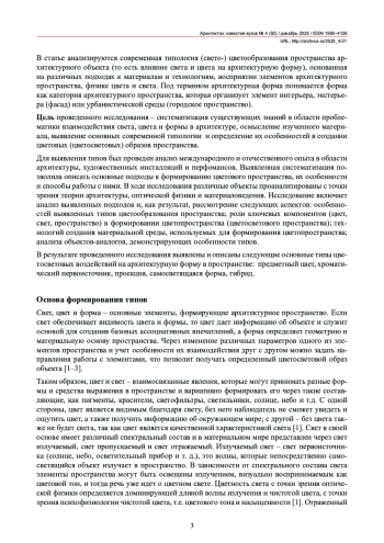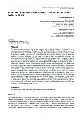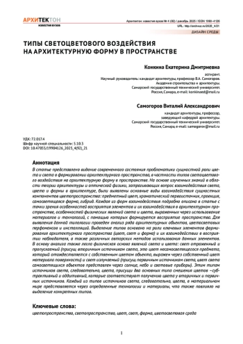 В статье представлено видение современного состояния проблематики сущностной роли цвета и света в формировании архитектурного пространства, в частности типов светоцветового воздействия на архитектурную форму в пространстве. На основе изученных знаний в области теории архитектуры и оптической физики, затрагивающих вопрос взаимодействия света, цвета и формы в архитектуре, были выявлены основные виды взаимодействия сущностных компонентов цветопространства: предметный цвет, хроматический первоисточник, проекция, самосветящаяся форма, гибрид. Каждая из форм взаимодействия подробно описана в статье с точки зрения особенностей восприятия элементов и их взаимодействия в архитектурном пространстве, особенностей физических явлений света и цвета, выраженных через использование материалов и технологий, с помощью которых формируется восприятие пространства. Для выявления данной типологии проведен анализ ряда архитектурных объектов, цветосветовых перфомансов и инсталляций. Выделение типов основано на роли ключевых элементов формирования архитектурного пространства (цвет, свет и форма) и их взаимодействии в восприятии наблюдателя, а также различных авторских методов использования данных элементов. В основу анализа также легла физическая основа явлений света и цвета: свет отраженный и пропускаемый (присущ вторичным источникам света, это цвет несамосветящегося предмета, который отождествляется с собственным цветом объекта, выражен через собственный цвет материала поверхности) и свет излучаемый (присущ первичным источникам света, цвет света самосветящихся объектов представлен через солнце, небо и световые приборы). Этим типам источников света, следовательно, цвета, присущи два основных типа смешения цветов –субтрактивный и аддитивный, которые соответствуют получению цвета у вторичных и первичных источников. Каждый из типов источников света, следовательно, цвета, в материальном мире представляется через определенные технологии и материалы, что также повлияло на выделение конкретных типов.