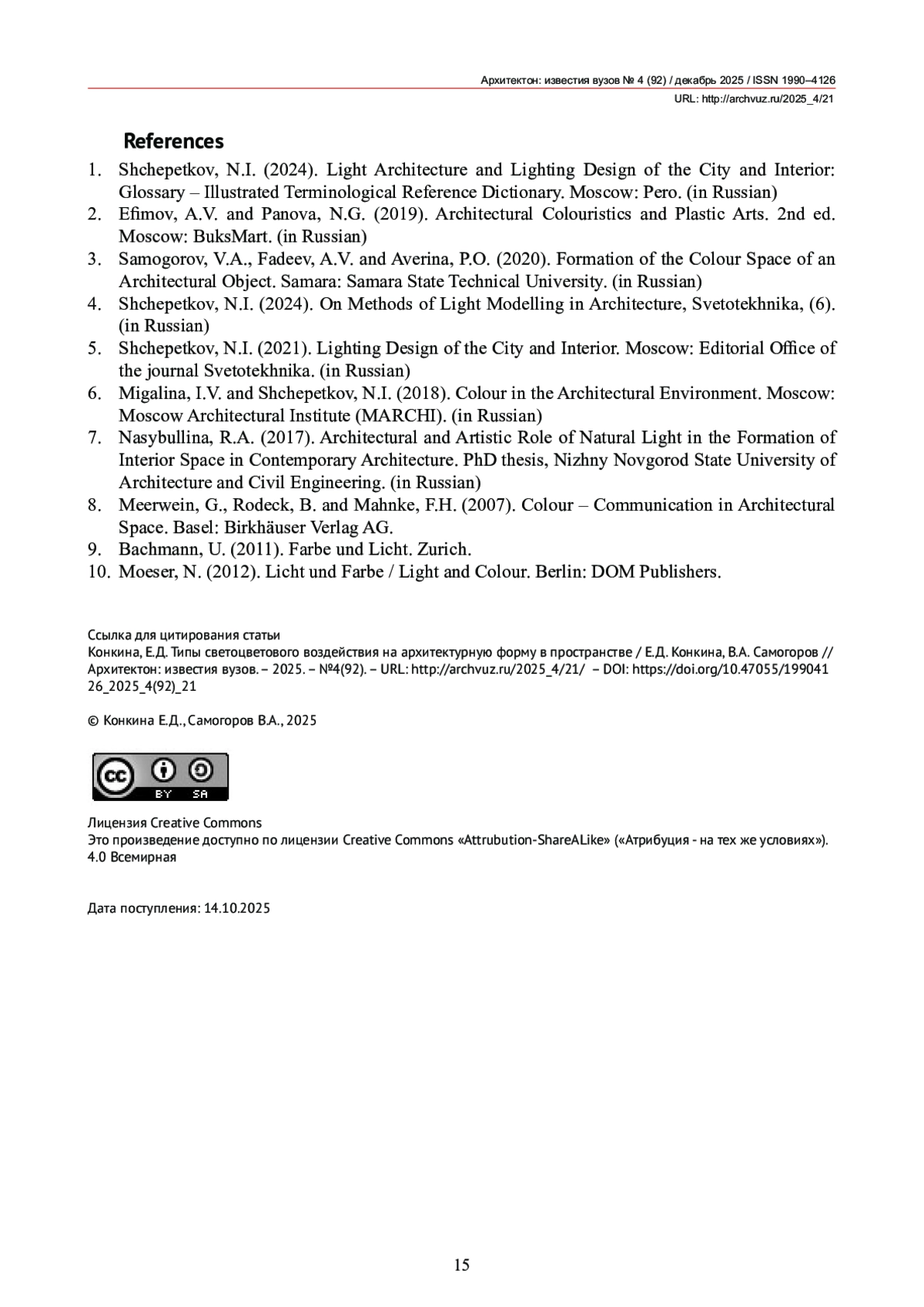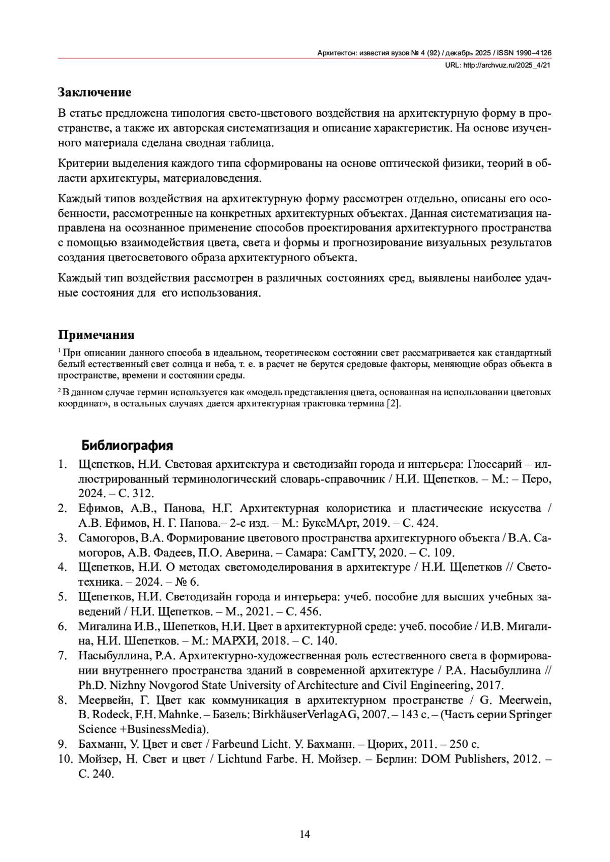 4. Щепетков, Н.И. О методах светомоделирования в архитектуре / Н.И. Щепетков // Светотехника. - 2024. - № 6.