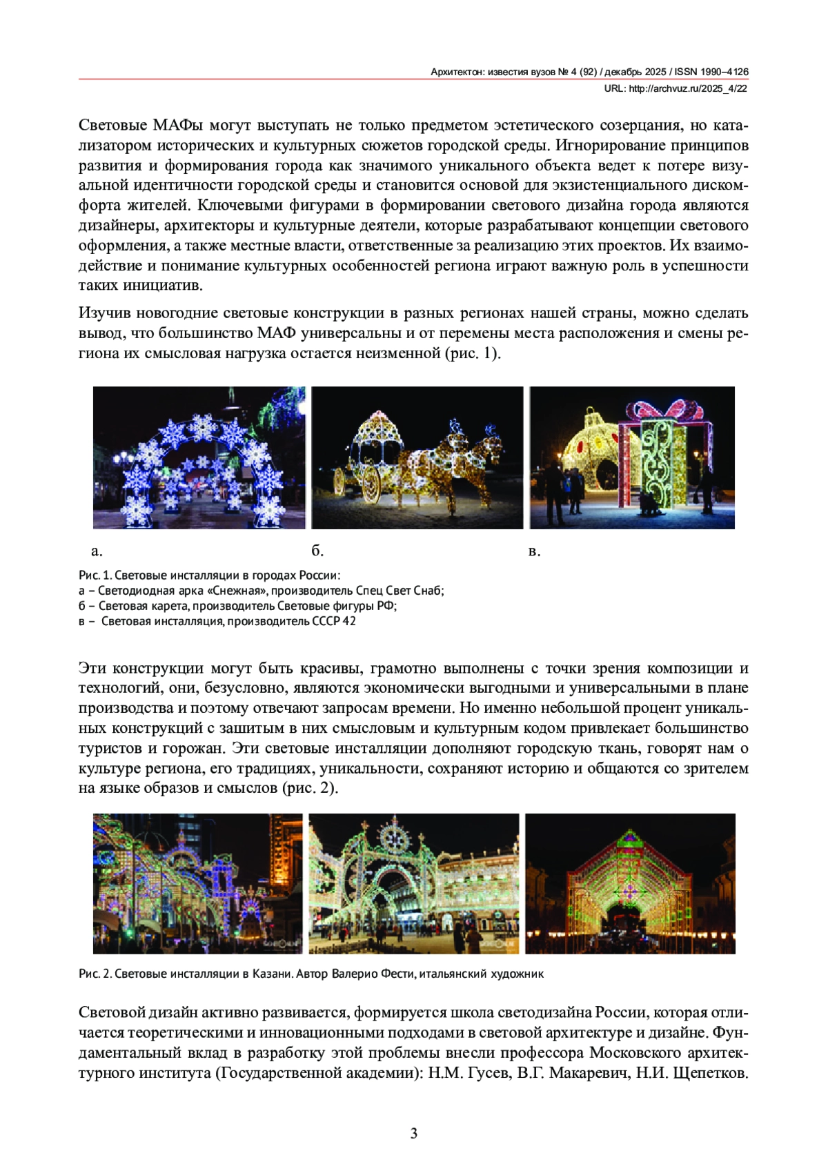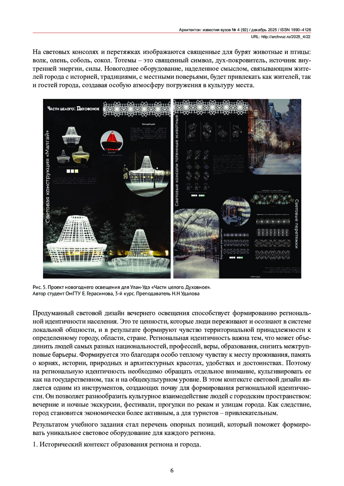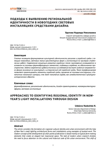 Статья посвящена формированию культурной идентичности регионов и городской среды с помощью новогодних, световых малых архитектурных форм и инсталляций на примерах студенческих работ. Современная концепция развития городских точек притяжения основывается в основном на типовых формообразующих элементах, создающих нарядное, но обезличенное пространство. Задача современных урбанистических исследований диктует создание направленного фокуса внимания на культурный и исторический код городской среды. Такая перефокусировка позволяет проектировать элементы городской среды, применяя не типовые конструкции, а динамичные локальные сценарии, что дает понимание города, как самодостаточного культурноисторического объекта.