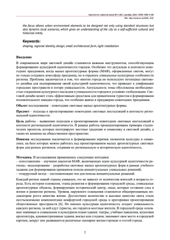 В современном мире световой дизайн становится важным инструментом, способствующим формированию культурной идентичности городов. Особенно это актуально в контексте новогодних праздников, когда малые архитектурные формы (МАФ), оформленные светом, могут не только создавать атмосферу праздника, но и отражать уникальные культурные особенности региона. Проблема заключается в том, что многие города не используют потенциал светового дизайна для подчеркивания своей культурной идентичности, что приводит к унификации городских пространств и потере уникальности. Актуальность темы обусловлена необходимостью сохранения культурного наследия и уникальности городов в условиях глобализации. Световой дизайн может стать эффективным средством для привлечения туристов и формирования положительного имиджа города, что особенно важно в преддверии новогодних праздников.