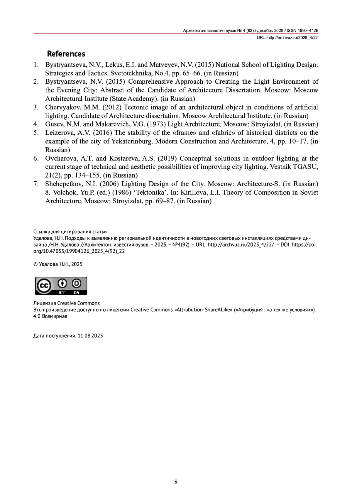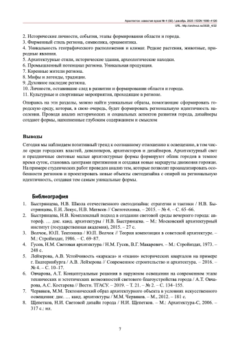 6. Овчарова, А.Т. Концептуальные решения в наружном освещении на современном этапе технических и эстетических возможностей светового благоустройства города / А.Т. Овчарова, А.С. Костарева // Вестн. ТГАСУ. - 2019. - Т. 21. - № 2. - С. 134-155.