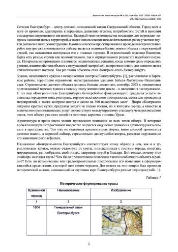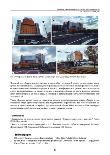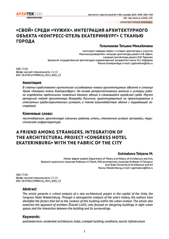 В статье представлено критическое исследование нового архитектурного объекта в столице Урала «Конгресс-отель Екатеринбург». На основе ретроспективного анализа и истории района определены предпосылки появления данного здания в сложившейся городской среде. Изучен авторский подход архитектора Живорада Лисичича, ориентированный на проектирование в стесненных градостроительных условиях, а также взаимодействие здания с окружающей застройкой.