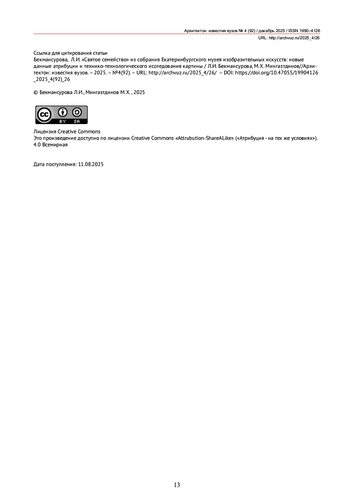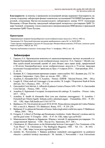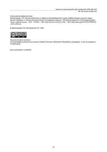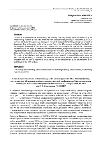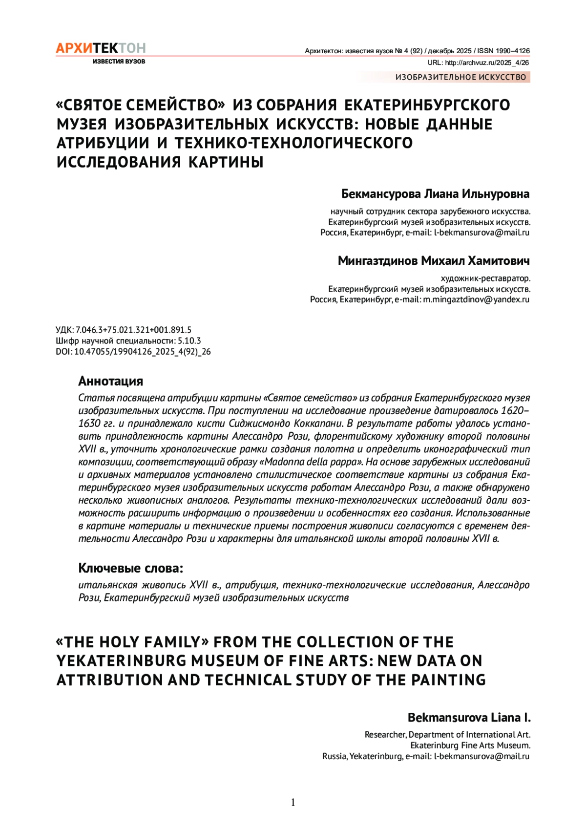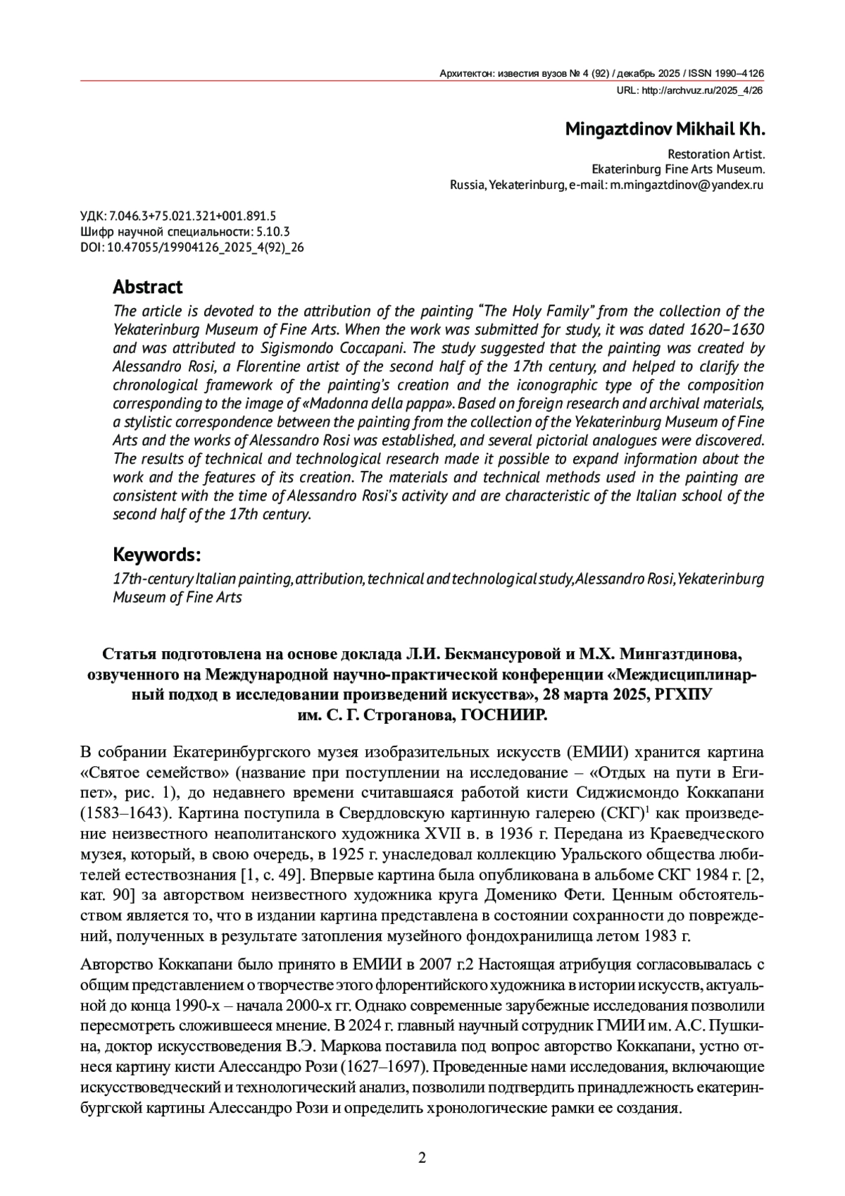 Статья посвящена атрибуции картины «Святое семейство» из собрания Екатеринбургского музея изобразительных искусств. При поступлении на исследование произведение датировалось 1620– 1630 гг. и принадлежало кисти Сиджисмондо Коккапани. В результате работы удалось установить принадлежность картины Алессандро Рози, флорентийскому художнику второй половины XVII в., уточнить хронологические рамки создания полотна и определить иконографический тип композиции, соответствующий образу «Madonna della pappa». На основе зарубежных исследований и архивных материалов установлено стилистическое соответствие картины из собрания Екатеринбургского музея изобразительных искусств работам Алессандро Рози, а также обнаружено несколько живописных аналогов. Результаты технико-технологических исследований дали возможность расширить информацию о произведении и особенностях его создания. Использованные в картине материалы и технические приемы построения живописи согласуются с временем деятельности Алессандро Рози и характерны для итальянской школы второй половины XVII в.