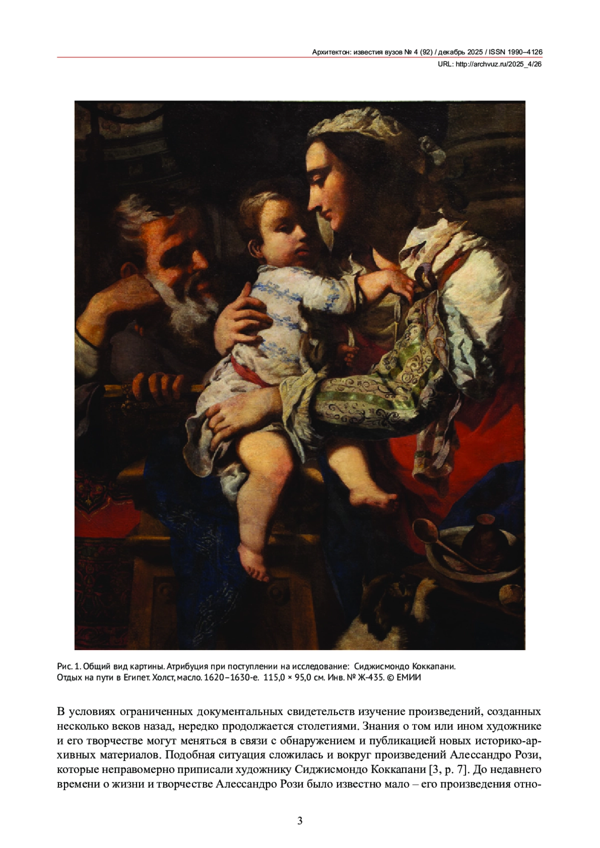 В собрании Екатеринбургского музея изобразительных искусств (ЕМИИ) хранится картина «Святое семейство» (название при поступлении на исследование – «Отдых на пути в Египет», рис. 1), до недавнего времени считавшаяся работой кисти Сиджисмондо Коккапани (1583–1643). Картина поступила в Свердловскую картинную галерею (СКГ)1 как произведение неизвестного неаполитанского художника XVII в. в 1936 г. Передана из Краеведческого музея, который, в свою очередь, в 1925 г. унаследовал коллекцию Уральского общества любителей естествознания [1, с. 49]. Впервые картина была опубликована в альбоме СКГ 1984 г. [2, кат. 90] за авторством неизвестного художника круга Доменико Фети. Ценным обстоятельством является то, что в издании картина представлена в состоянии сохранности до повреждений, полученных в результате затопления музейного фондохранилища летом 1983 г.