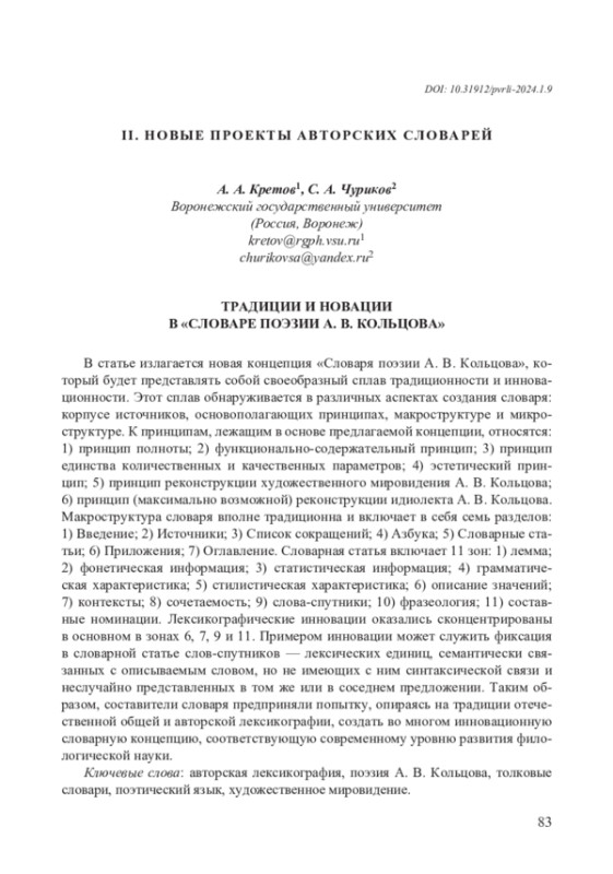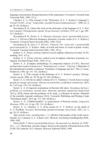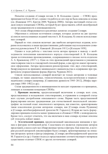 10. Кретов А. А. Концепция словаря поэзии А. В. Кольцова // Филологические записки. Вып. 28-29. Воронеж, 2009. С. 83-104. EDN: SHGQGL